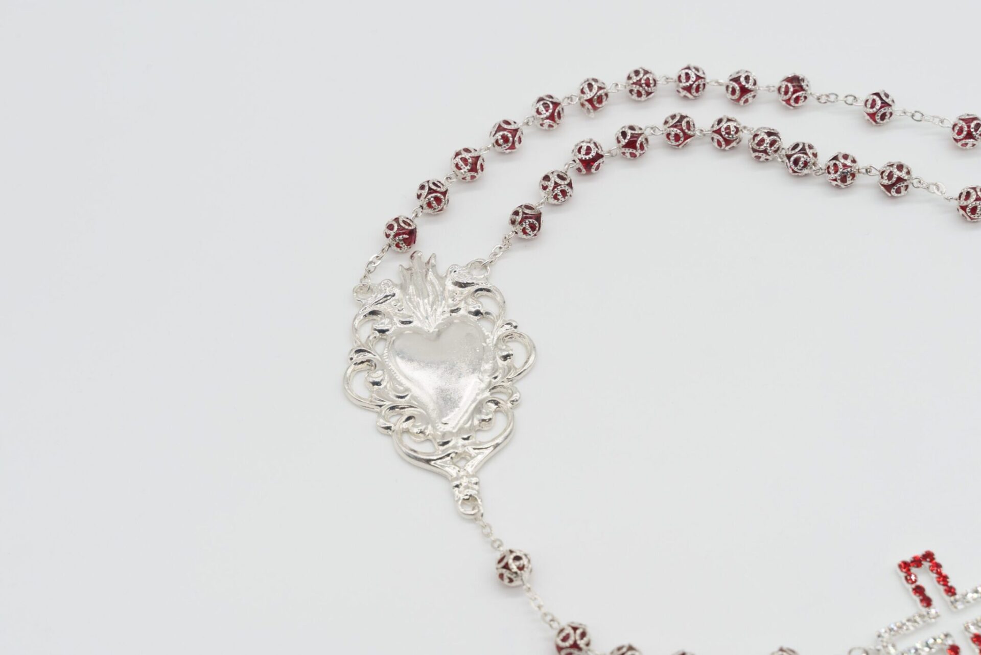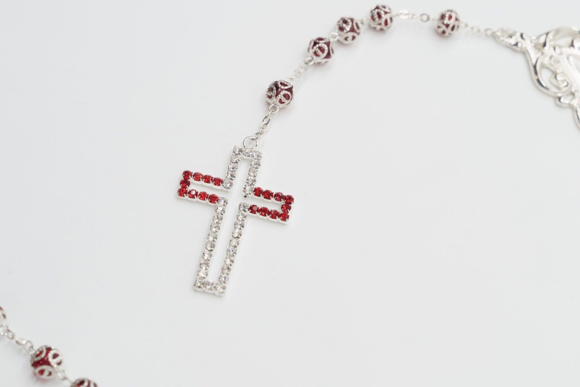 Rosario Ex Voto in cristallo rosso, croce con strass e grano con coppiglia del diametro di 8 mm, realizzato in Italia.