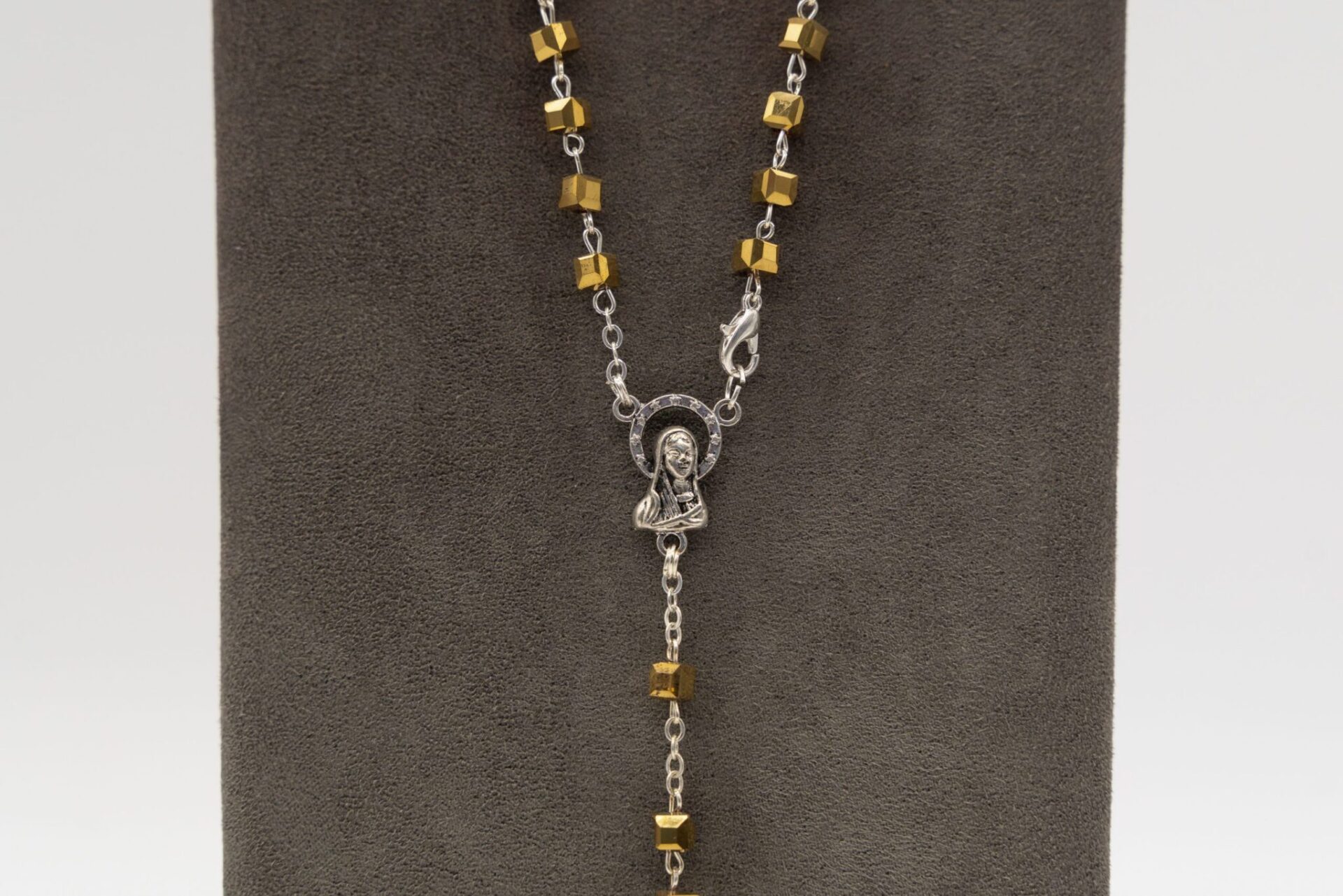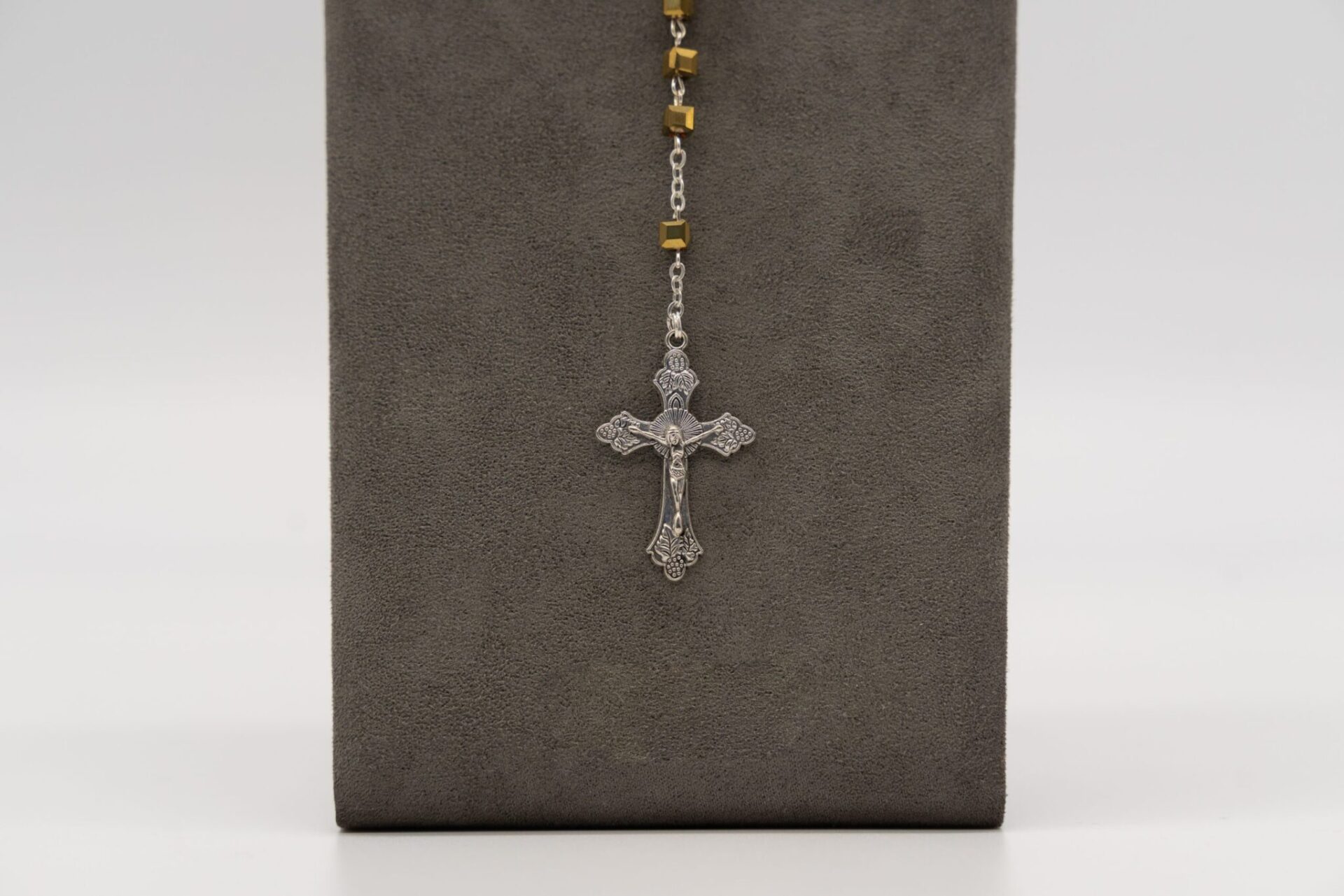 Il rosario con grani a cubo dorati rappresenta la luce divina e la bellezza della fede. I grani a forma di cubo simboleggiano la stabilità e la forza spirituale.