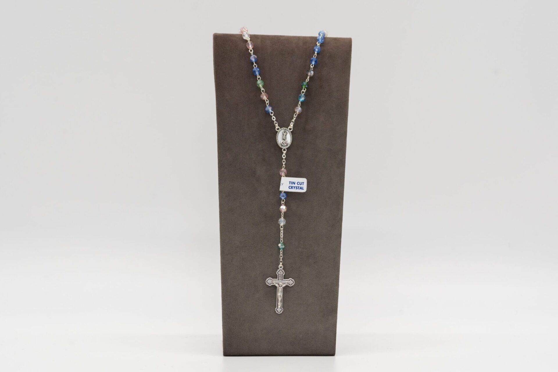 I cristalli colorati creano un effetto arcobaleno, conferendo al rosario un aspetto luminoso e vibrante.