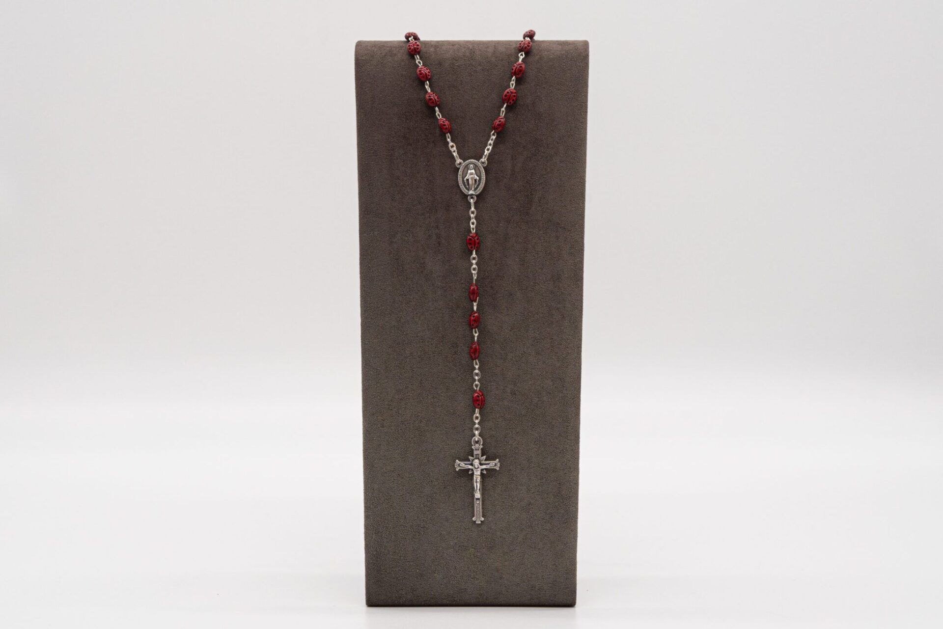 Il pregio del legno di cocco e la purezza dell’argento per un rosario classico e di qualità.