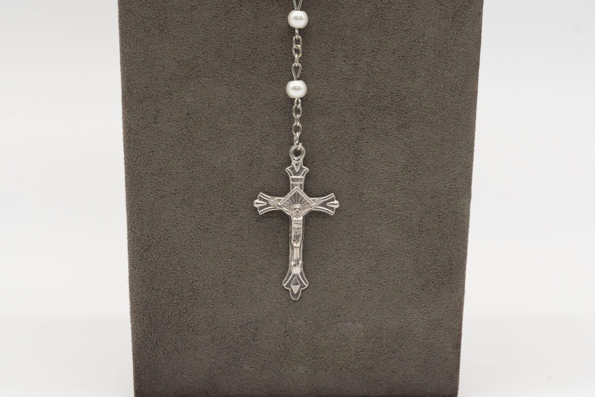 Al centro del rosario si trova un piccolo medaglione con la Vergine Maria, e alla fine del rosario pende una croce in metallo, decorata con dettagli intricati di Gesù crocifisso.