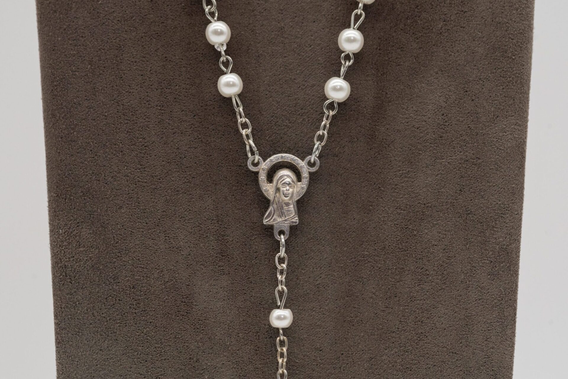 Il rosario in resina è composto da grani di resina bianca, disposti lungo una catena metallica.