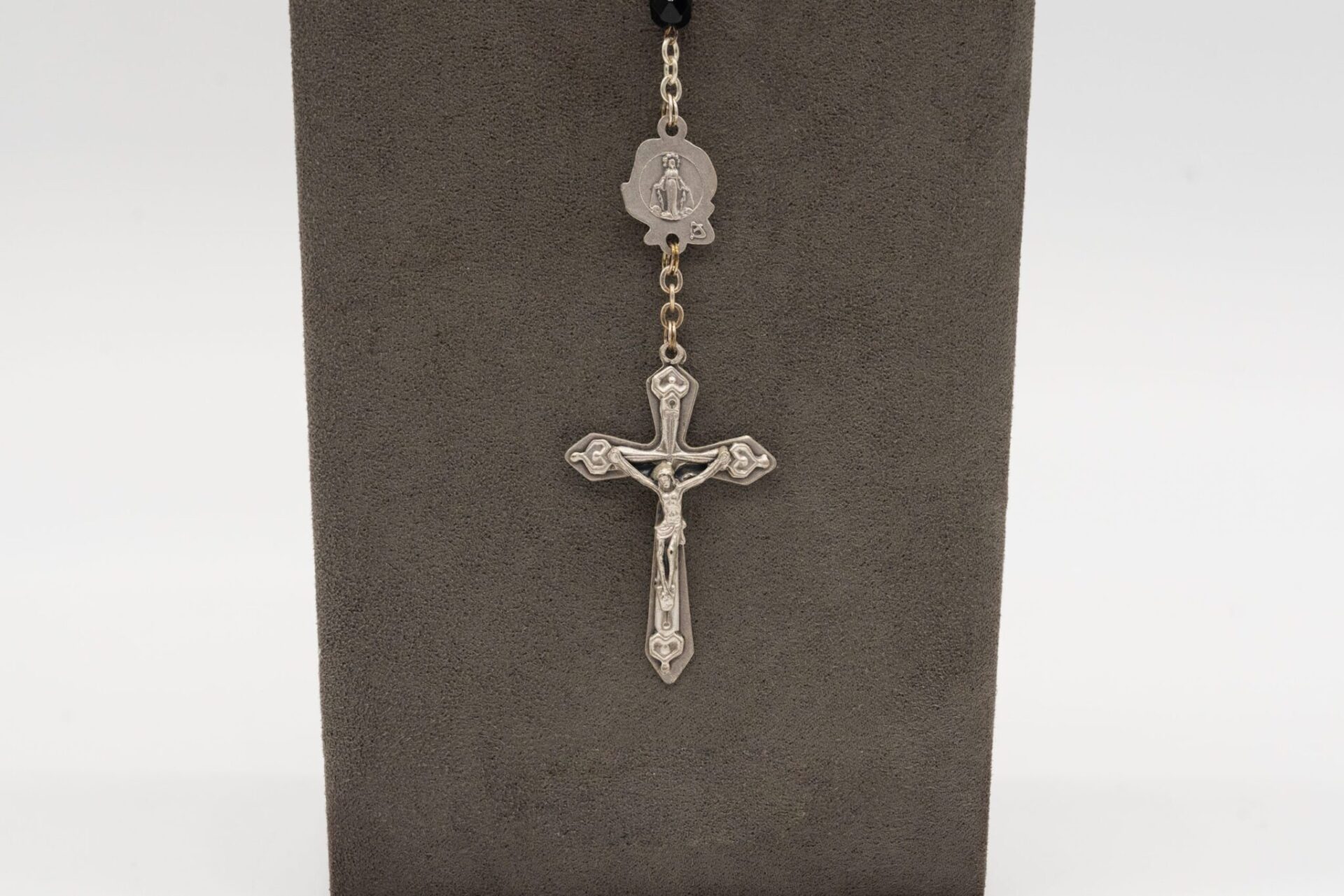 Alla fine del rosario, pende una croce metallica dettagliata e decorata, che rappresenta Gesù crocifisso.