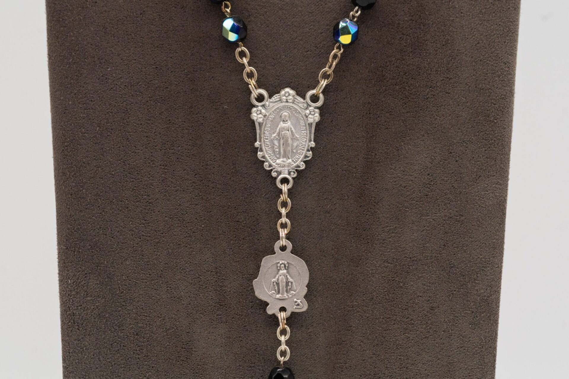 La coroncina del rosario è composta da perline di vetro blu scuro traslucido, disposte lungo una catena metallica.