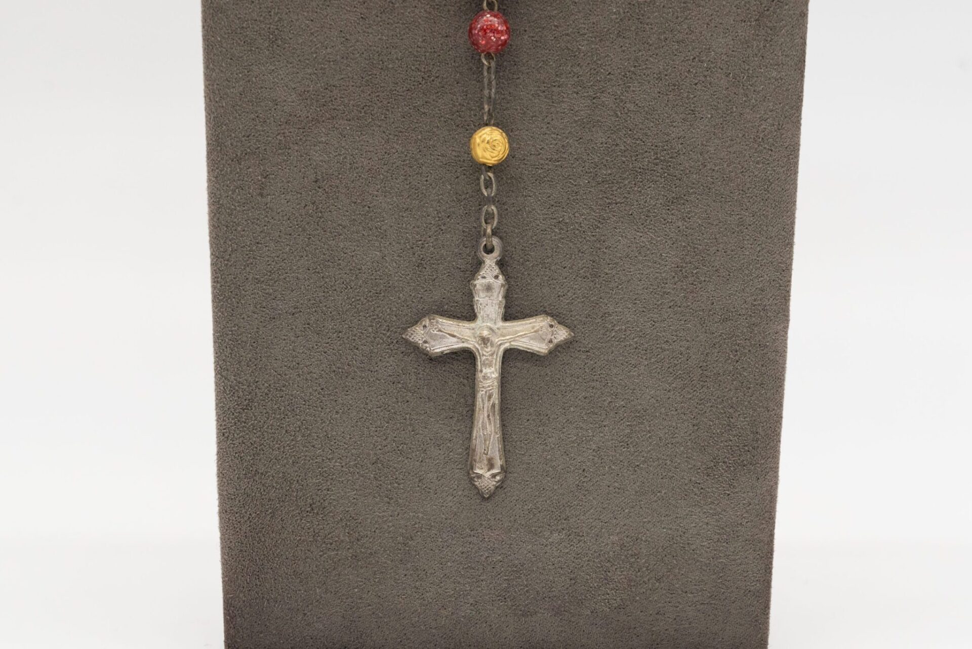 Il Rosario presenta grani dorati tra i grani rossi, aggiungendo un tocco di eleganza e raffinatezza, la Croce in metallo dorato completa l’oggetto.