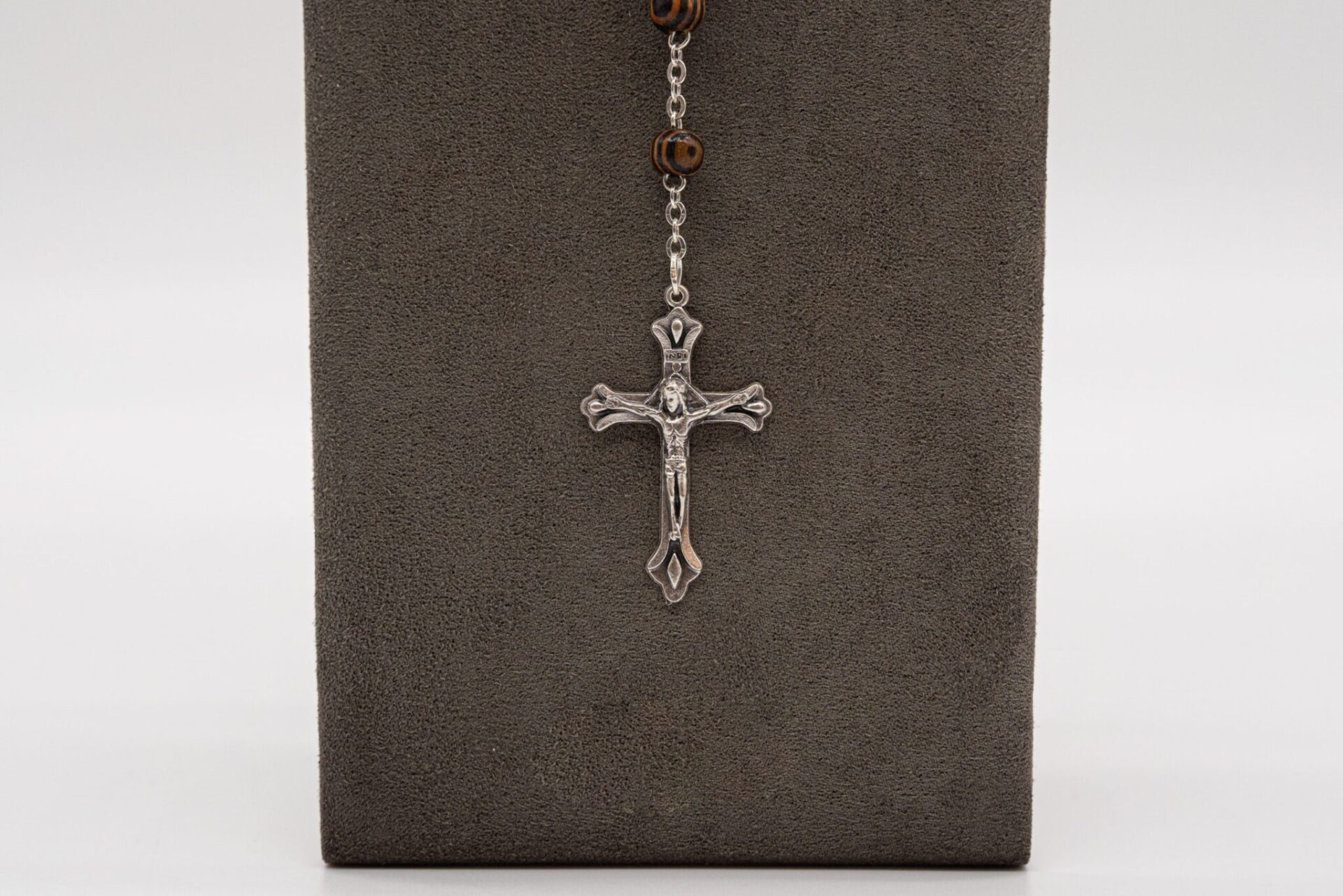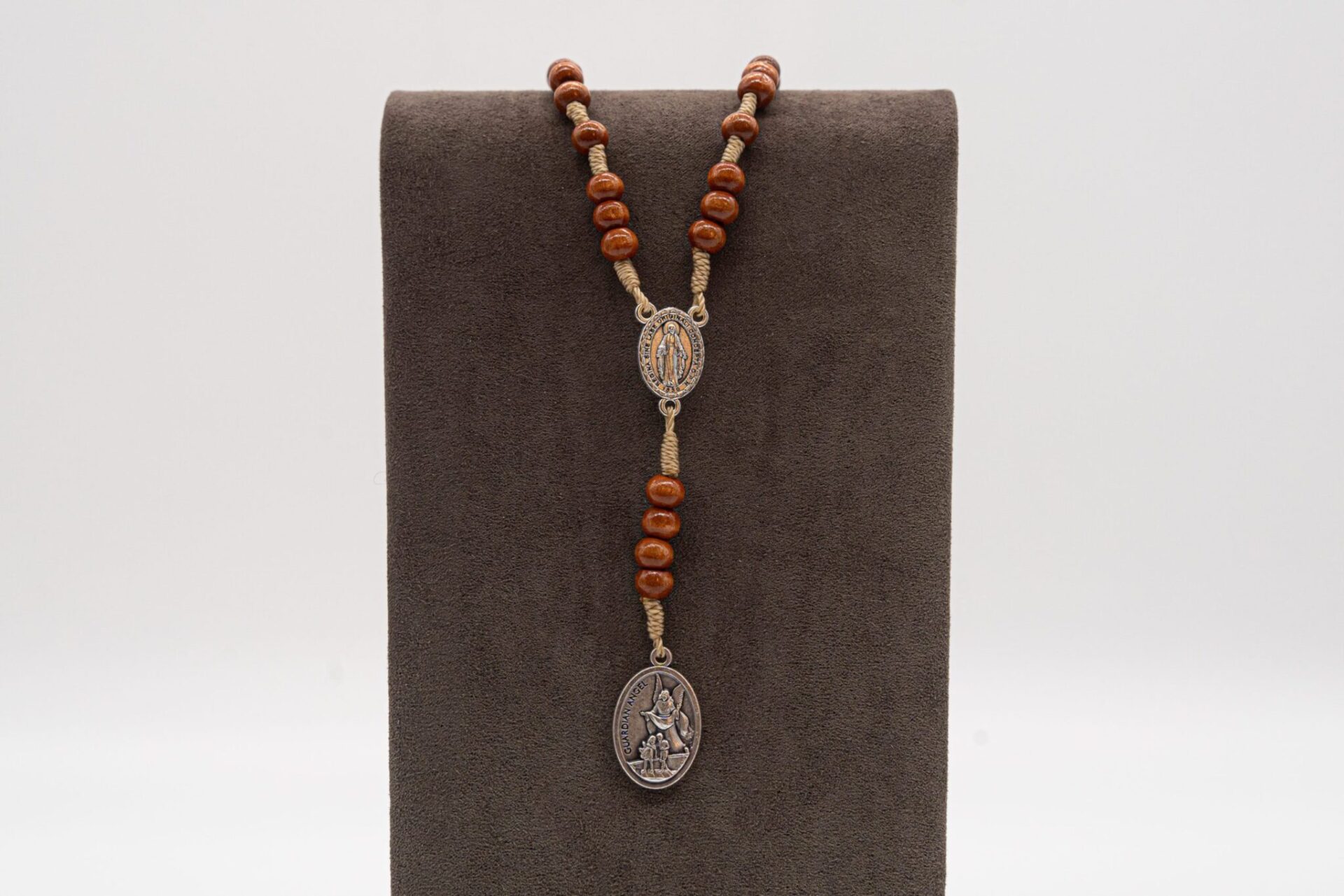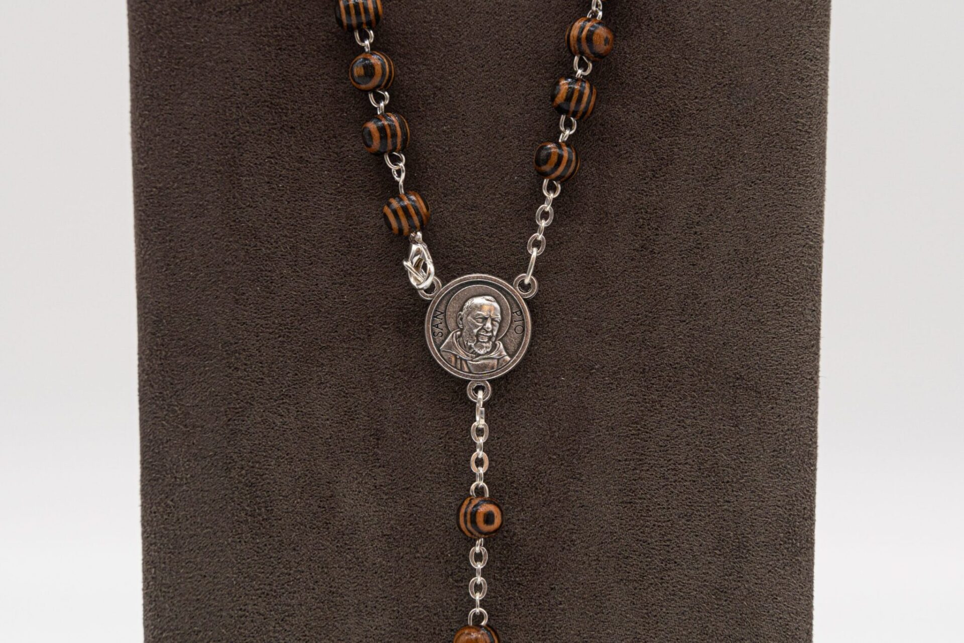 Rosario San Pio con grani in legno e gancetto per agganciarlo al collo come collana.