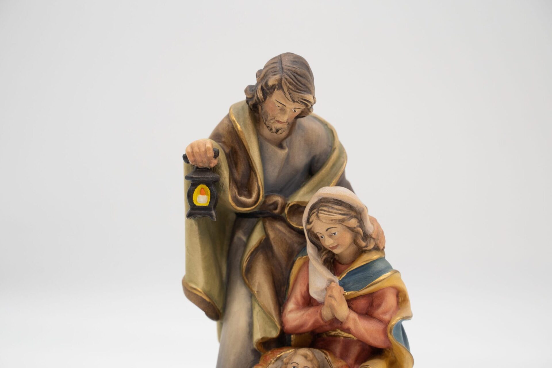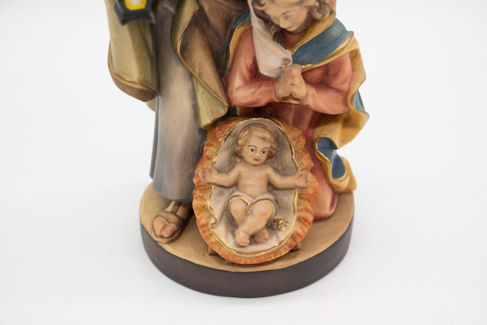 Scultura raffigurante la Natività in legno di cirmolo. “Il legno di cirmolo è ricavato dal pino cembro, chiamato anche semplicemente cembro o cirmolo. É un legno molto pregiato, che ritroviamo soprattutto nell’Europa centrale e in particolare sulle Alpi.” La scultura è scolpita e dipinta a mano con foglia oro da maestri artigiani, completamente di produzione Italiana.
