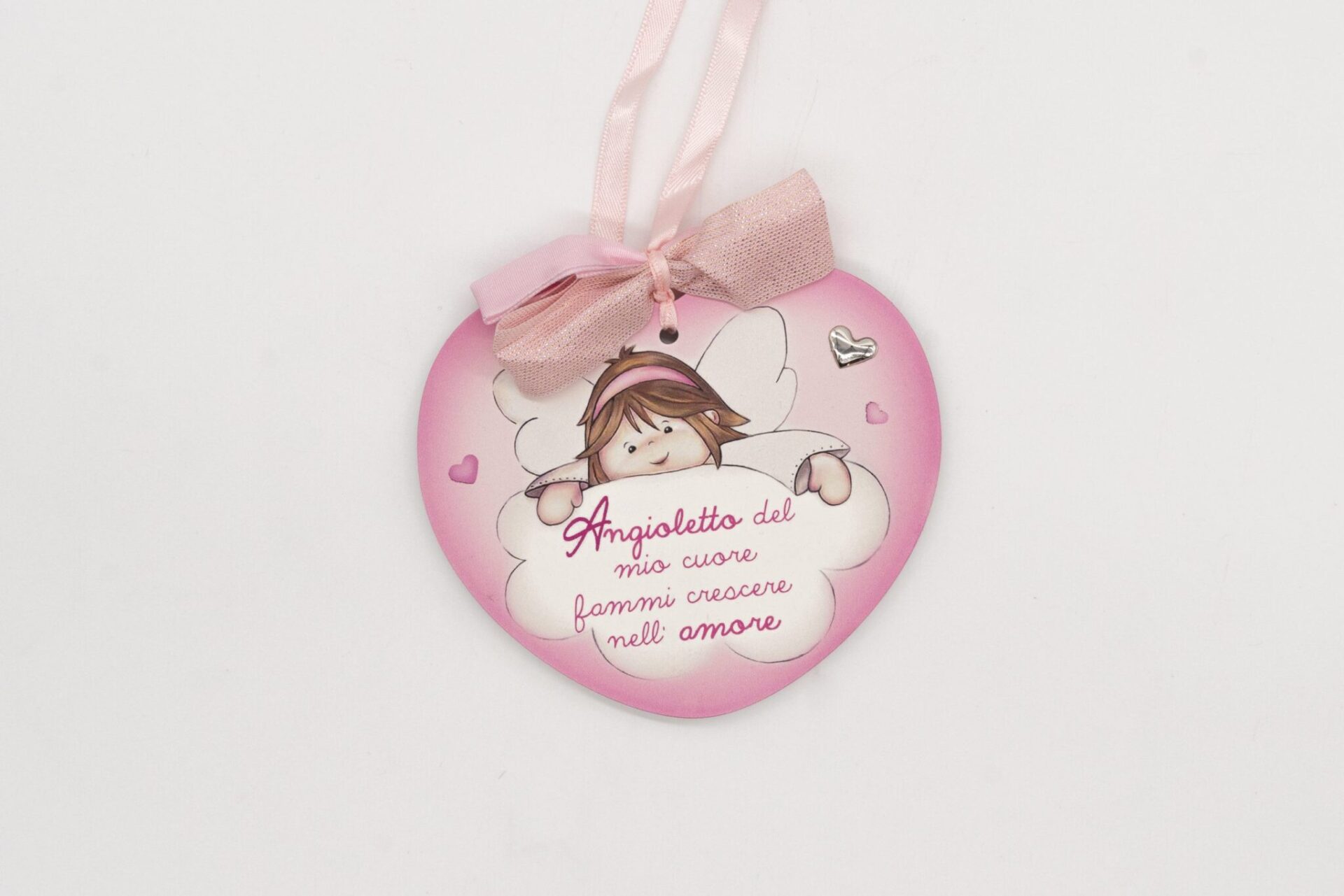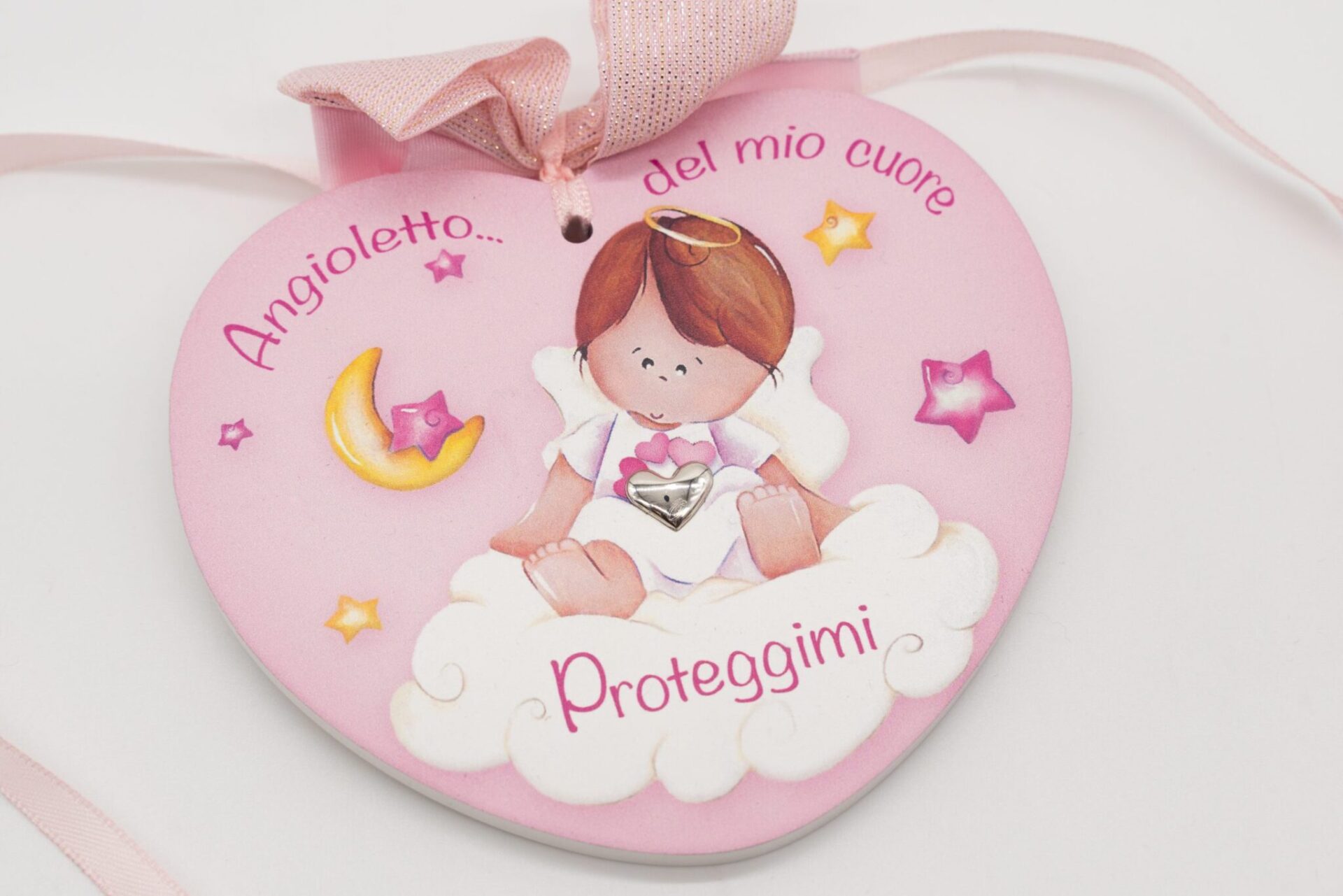 Sopra l’angioletto c’è la scritta “Angioletto… del mio cuore” e sotto l’angioletto, sulla nuvola, c’è la scritta “Proteggimi”.