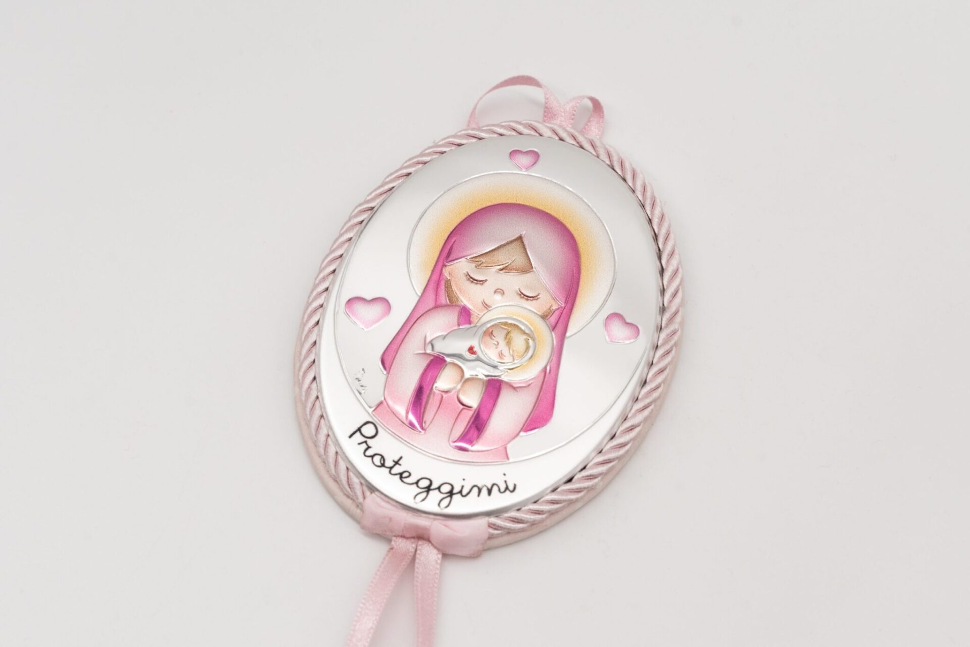 Il sopraculla ha anche un nastro rosa nella parte inferiore e un anello di nastro rosa nella parte superiore per appenderlo.