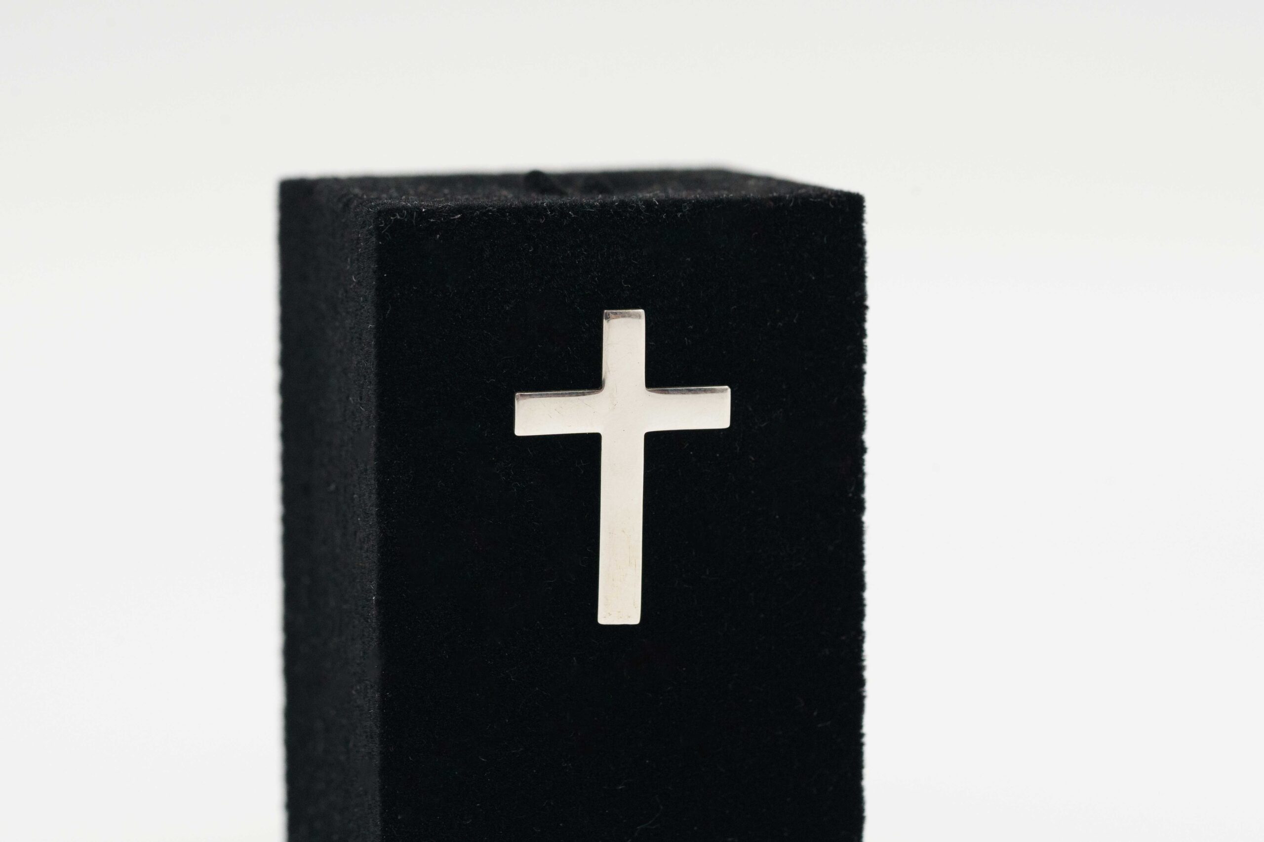 Al centro della spilletta campeggia una croce stilizzata, simbolo di fede e protezione. Le linee sono sobrie ma armoniose, adatte sia a un uso liturgico che quotidiano.