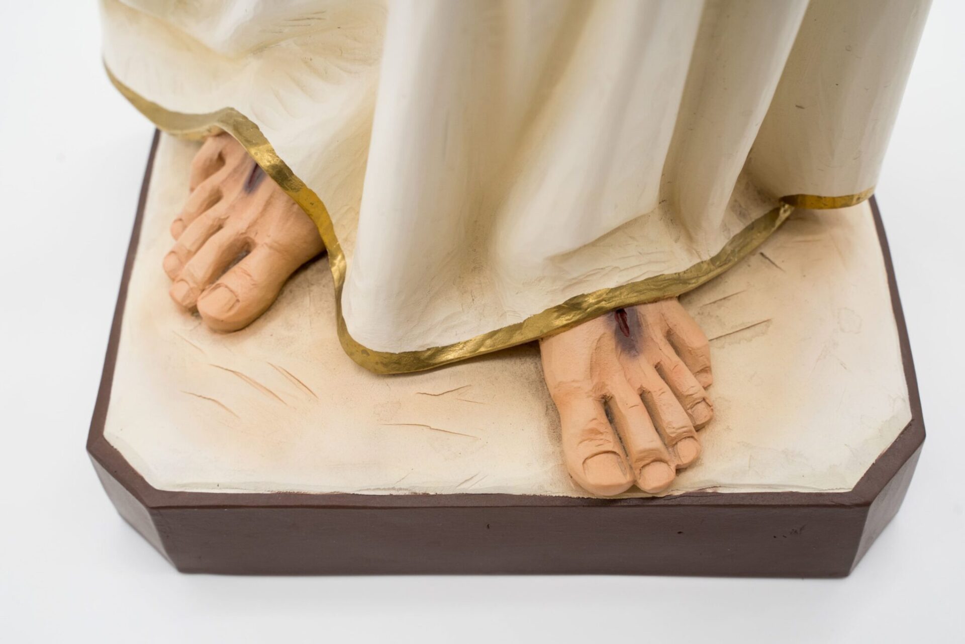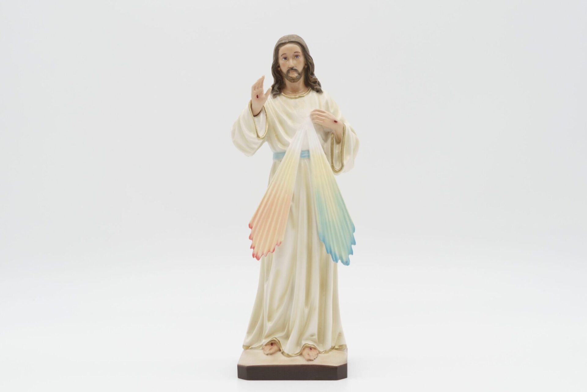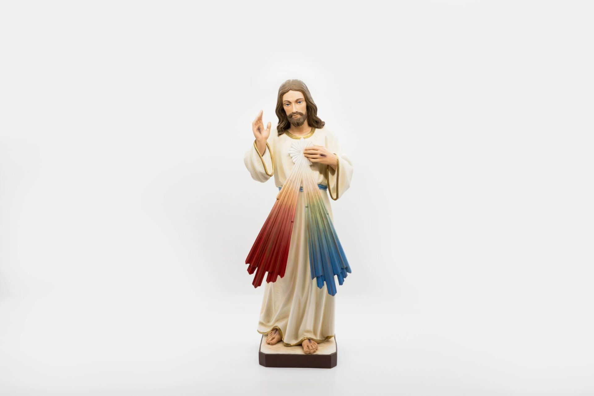 La statua rappresenta Gesù con una veste bianca e un mantello che emana raggi di luce di diversi colori: rosso, bianco e blu.