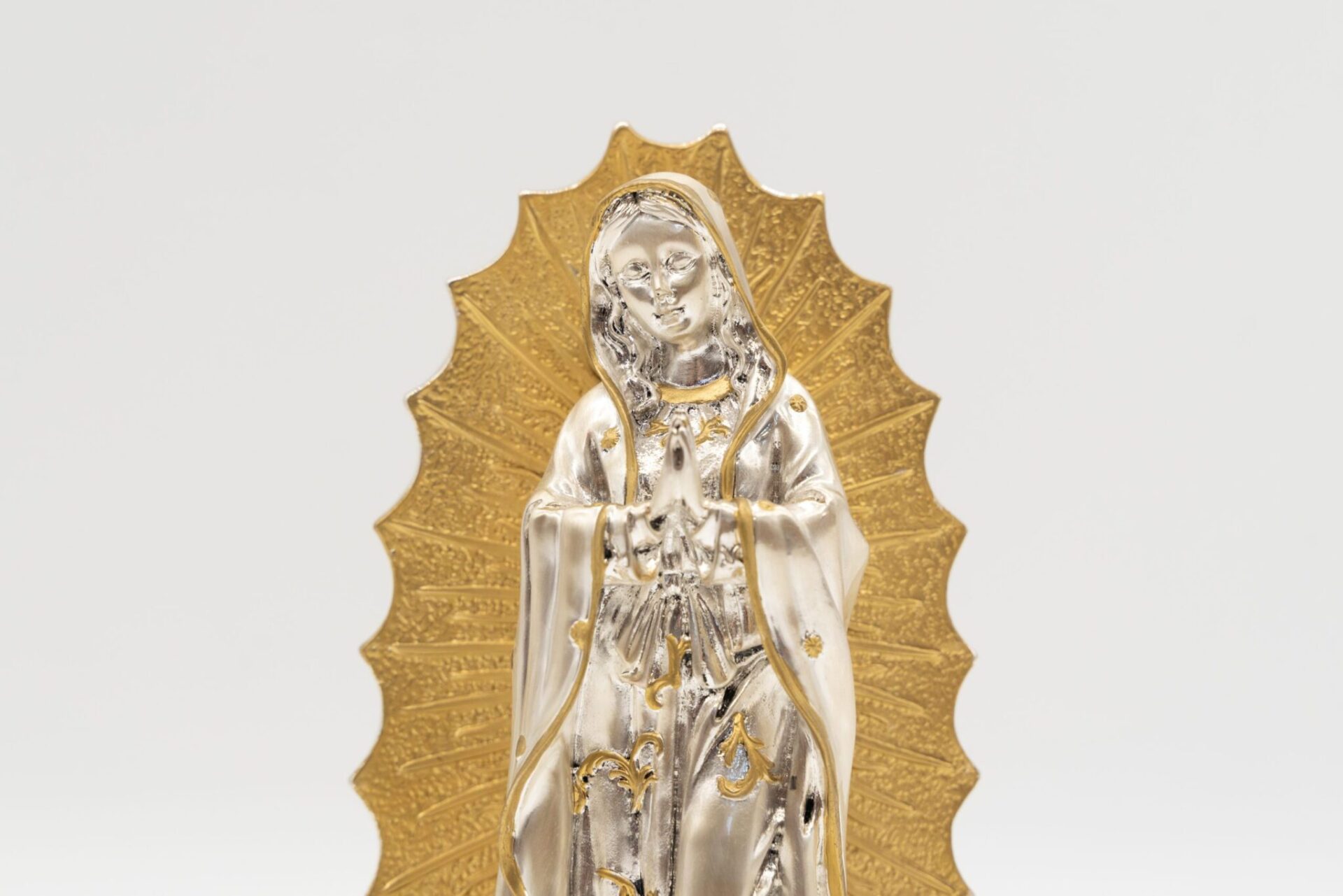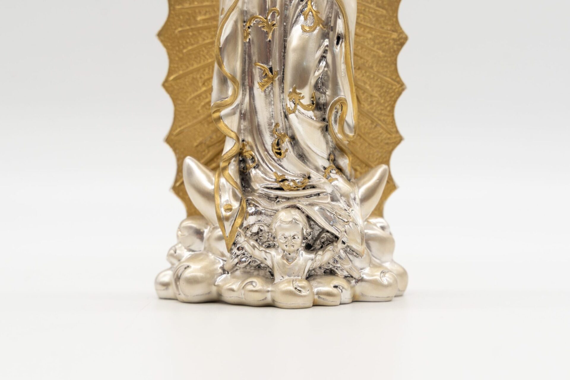Statua Nostra Signora di Guadalupe, realizzata in resina rivestita in argento.