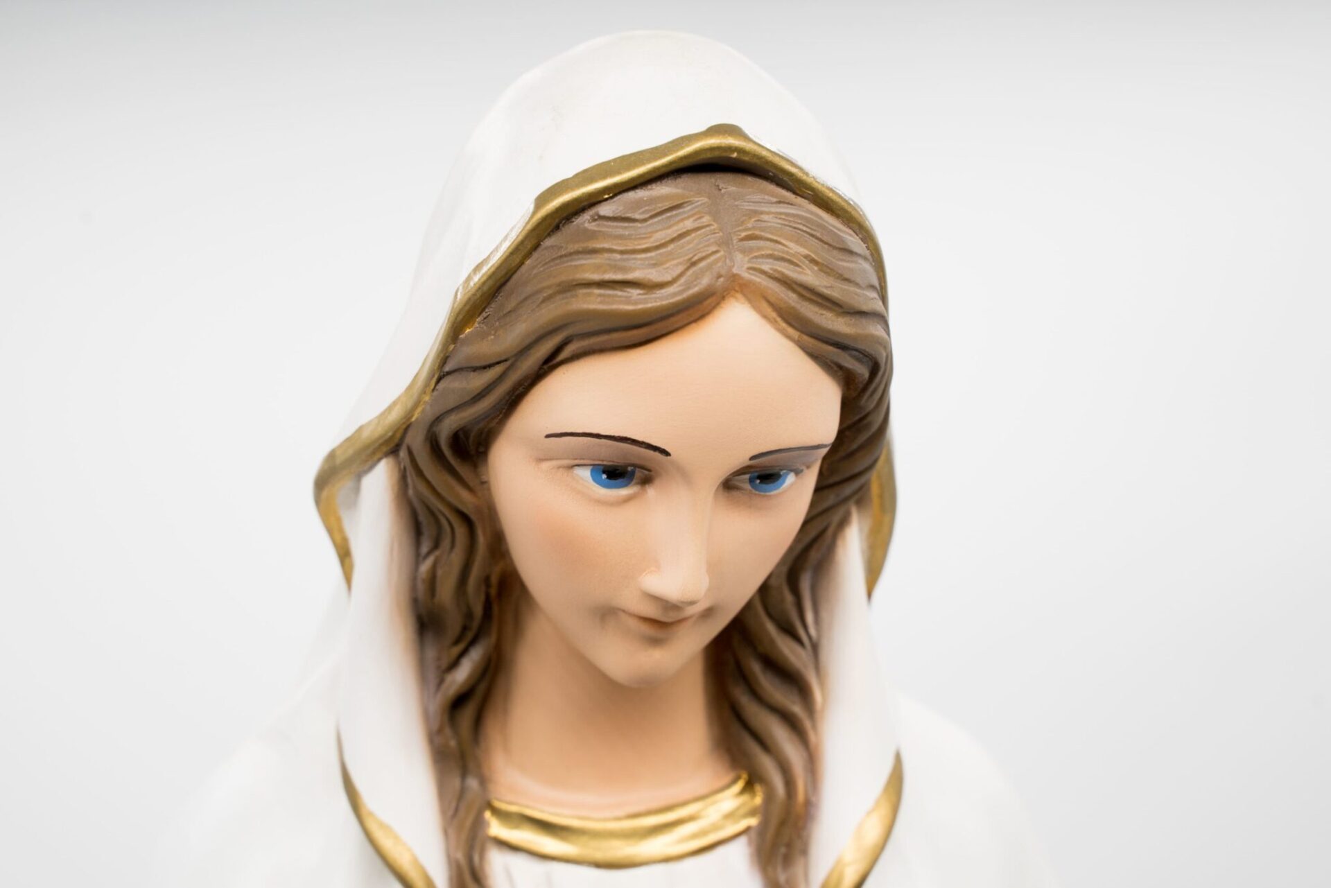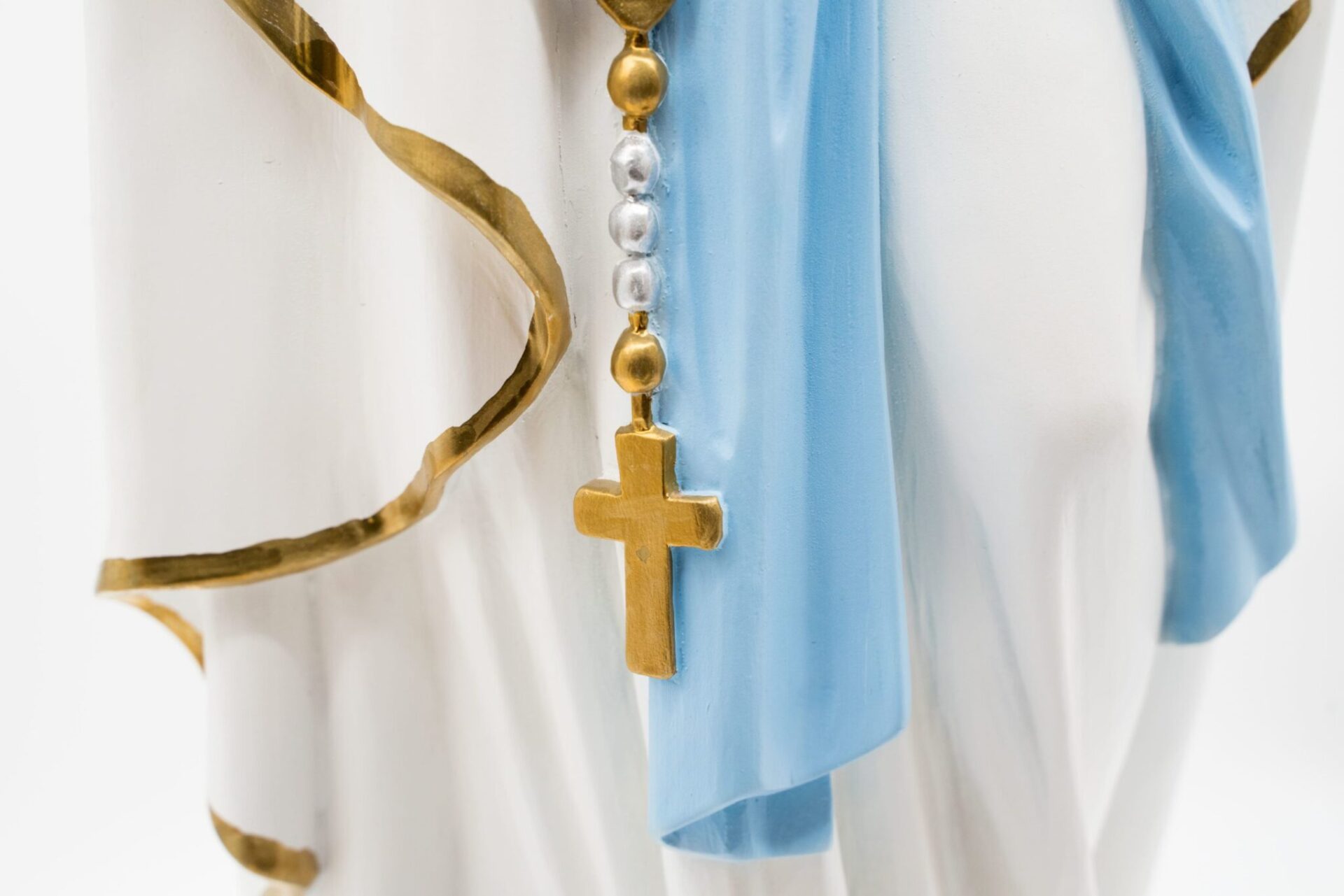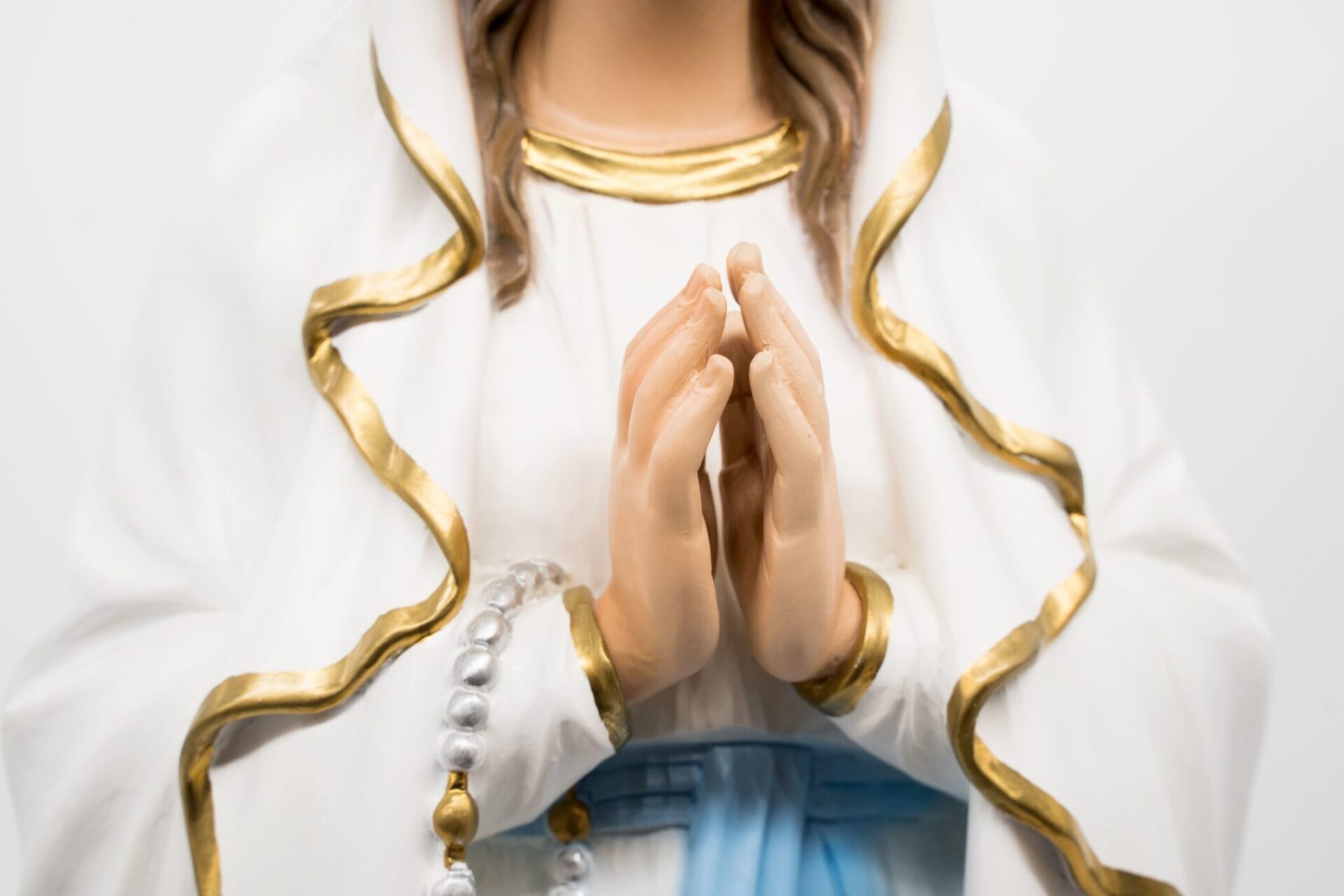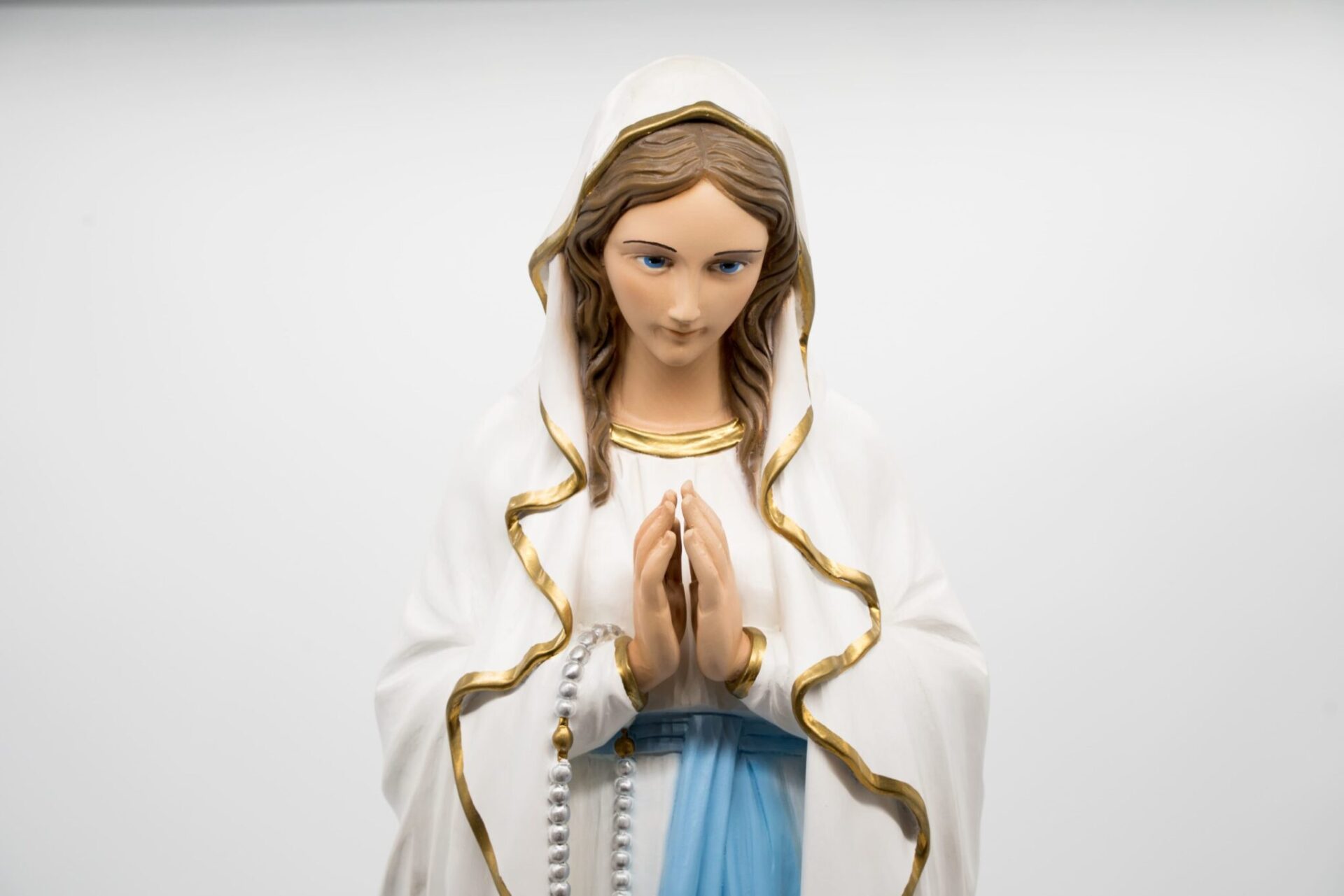 La Madonna è in piedi, con le mani giunte in preghiera, indossando un abito bianco con bordi dorati e una fascia azzurra intorno alla vita.