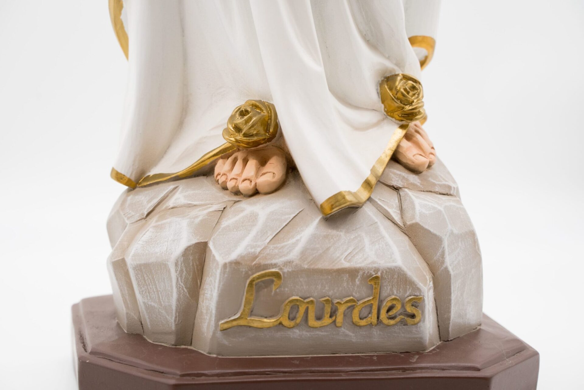 La statua è posizionata su una base che simula delle rocce, con la scritta “Lourdes” incisa sulla parte frontale della base.