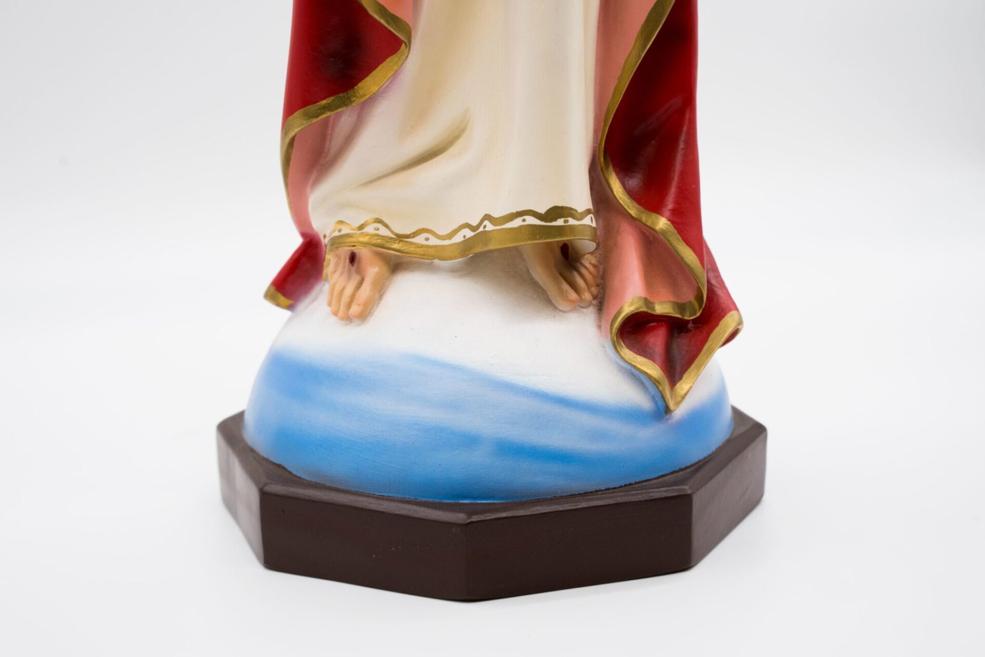 La statua è posta su una base dipinta in toni di blu e bianco.