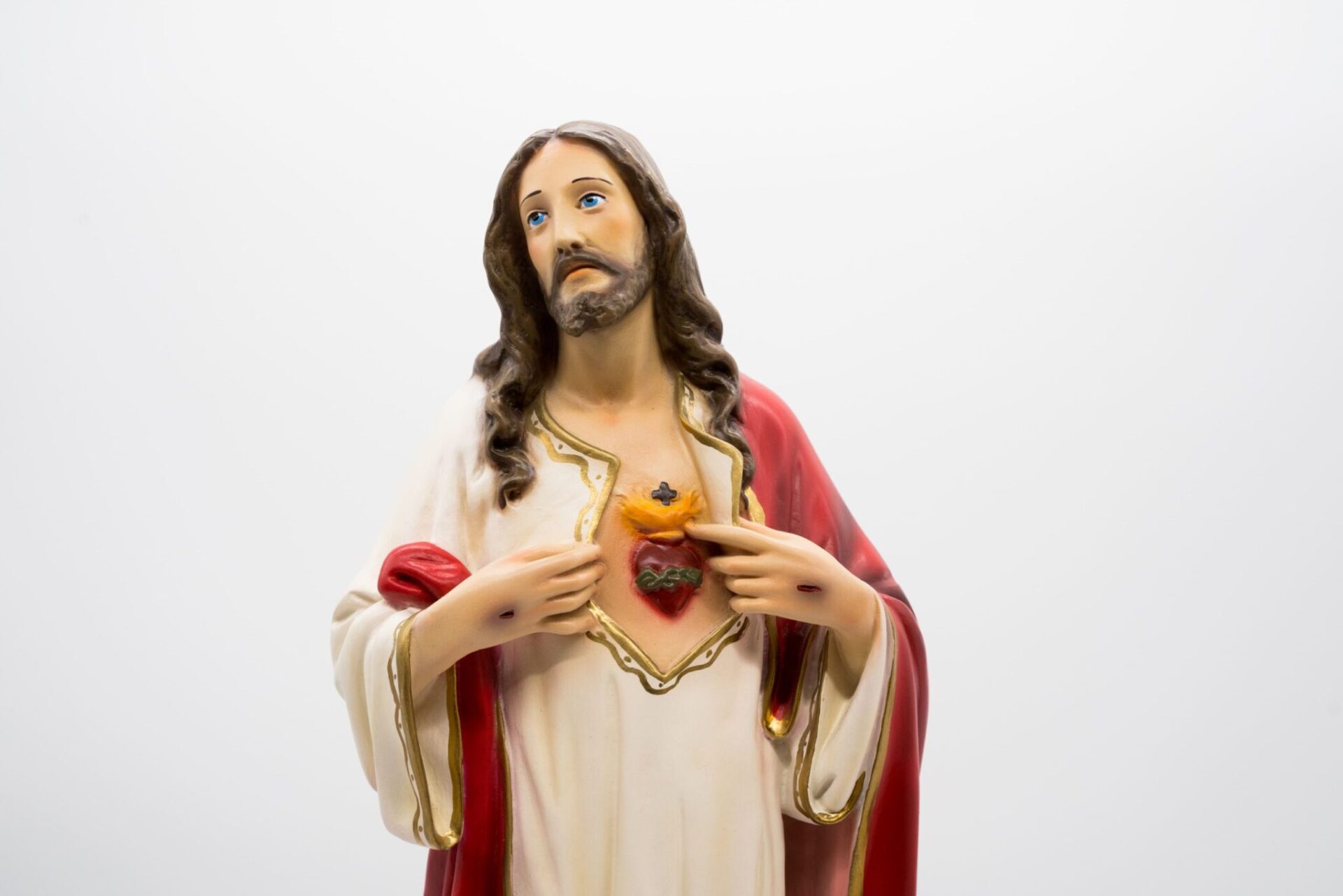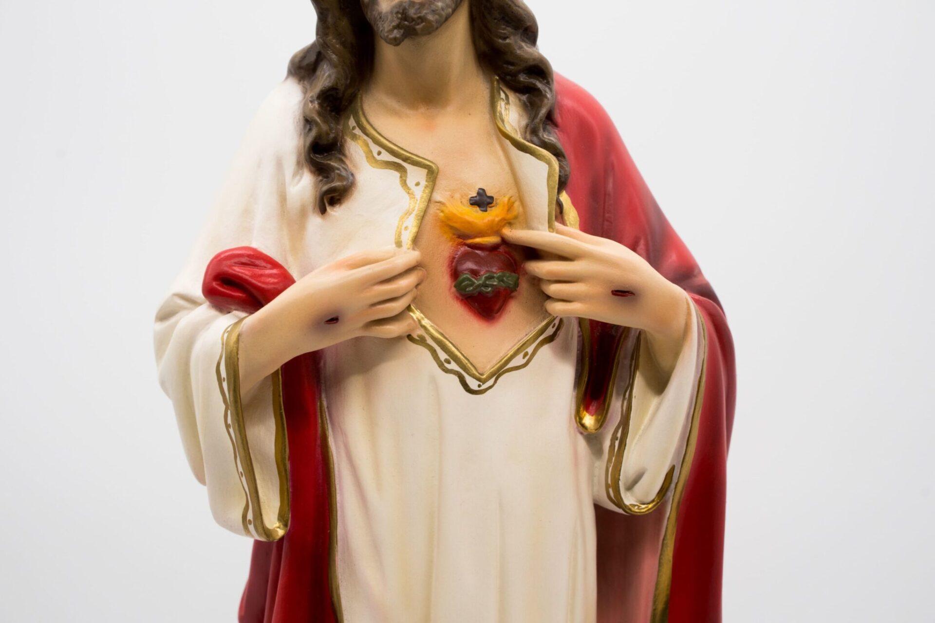 Gesù tiene il cuore al centro del petto, circondato da una corona di spine e con una fiamma che emerge dalla parte superiore, simbolo del Sacro Cuore.