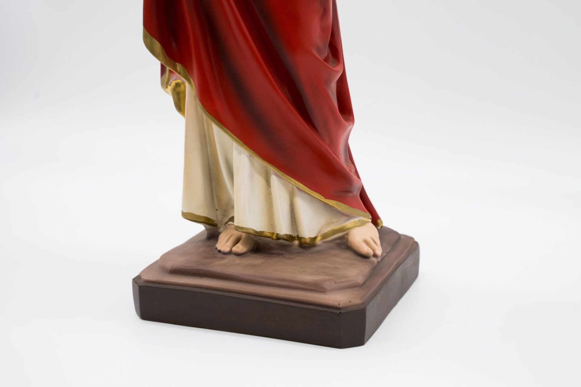Gesù Cristo è in piedi su una base marrone, indossando una tunica bianca e un mantello rosso che gli drappeggia sopra la spalla sinistra.