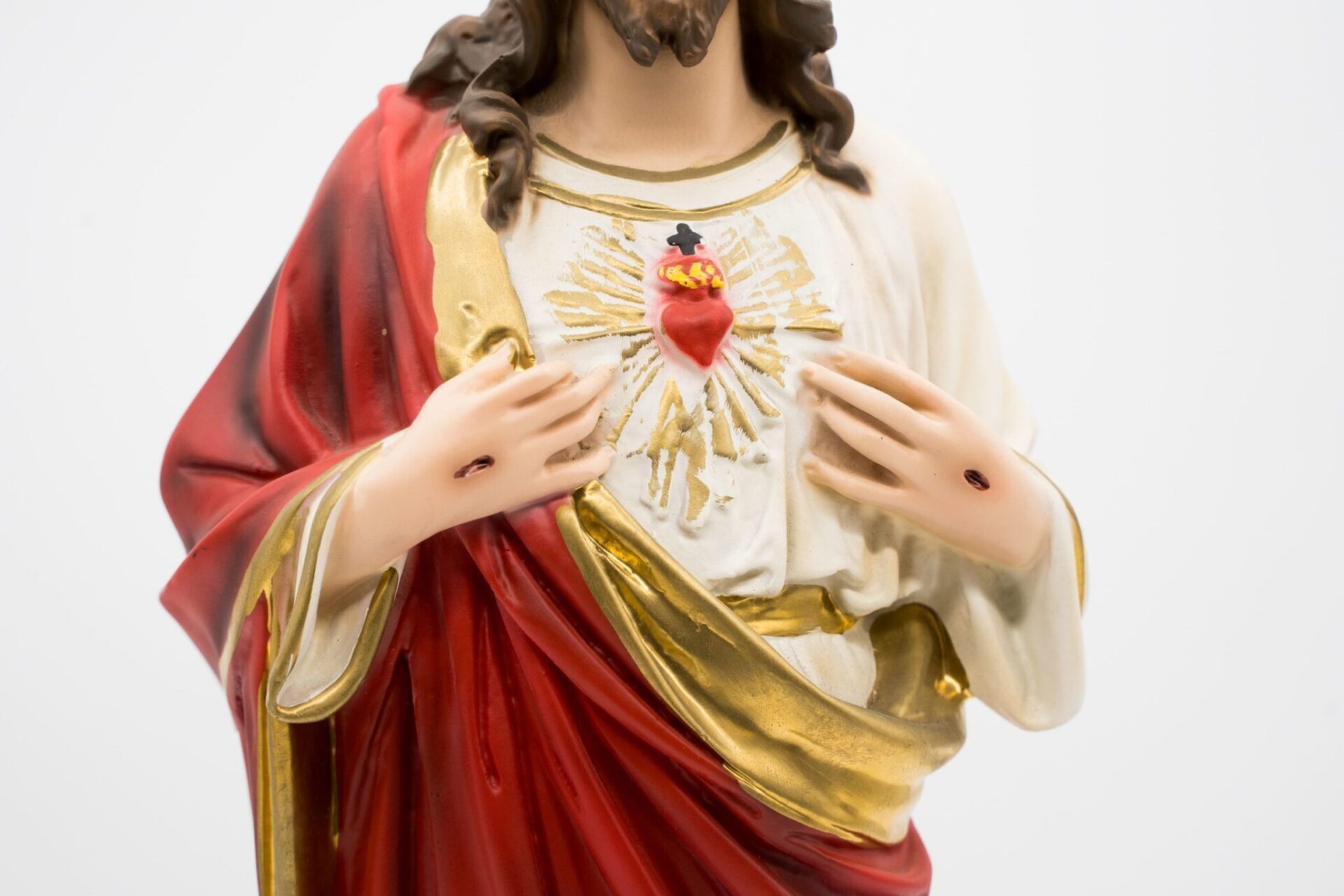 Gesù tiene le mani al petto, mostrando il Sacro Cuore, che è circondato da raggi di luce.
