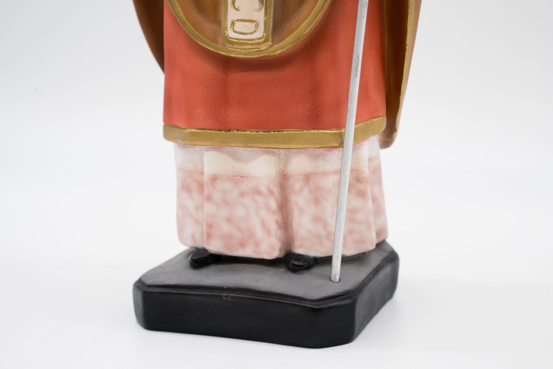 Nella mano sinistra, tiene un bastone pastorale dorato, simbolo della sua autorità ecclesiastica. Nella mano destra, regge un libro rosso con un piccolo oggetto sopra, che potrebbe rappresentare una reliquia o un simbolo religioso.