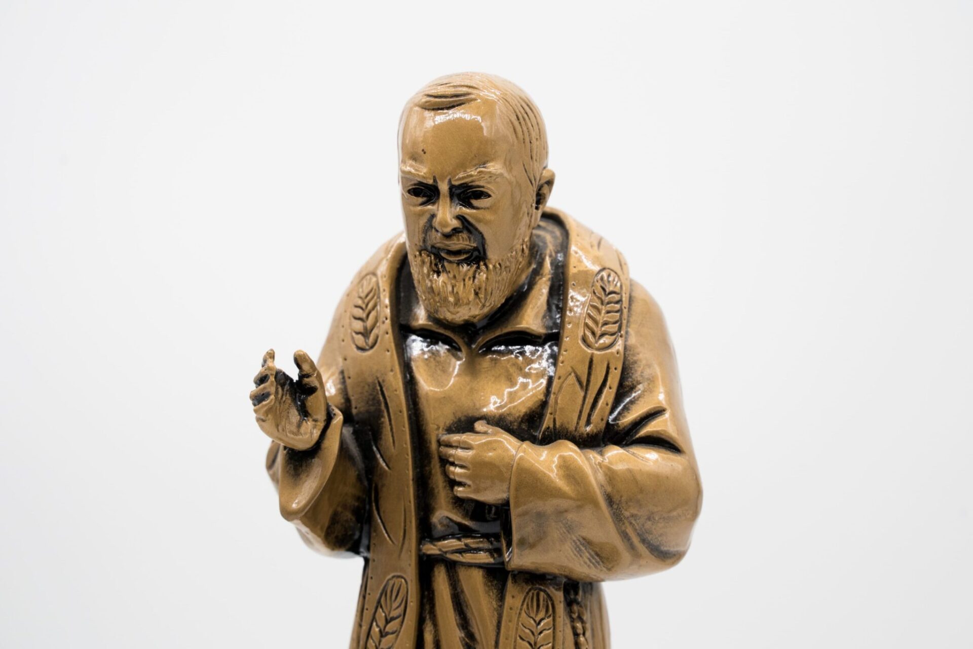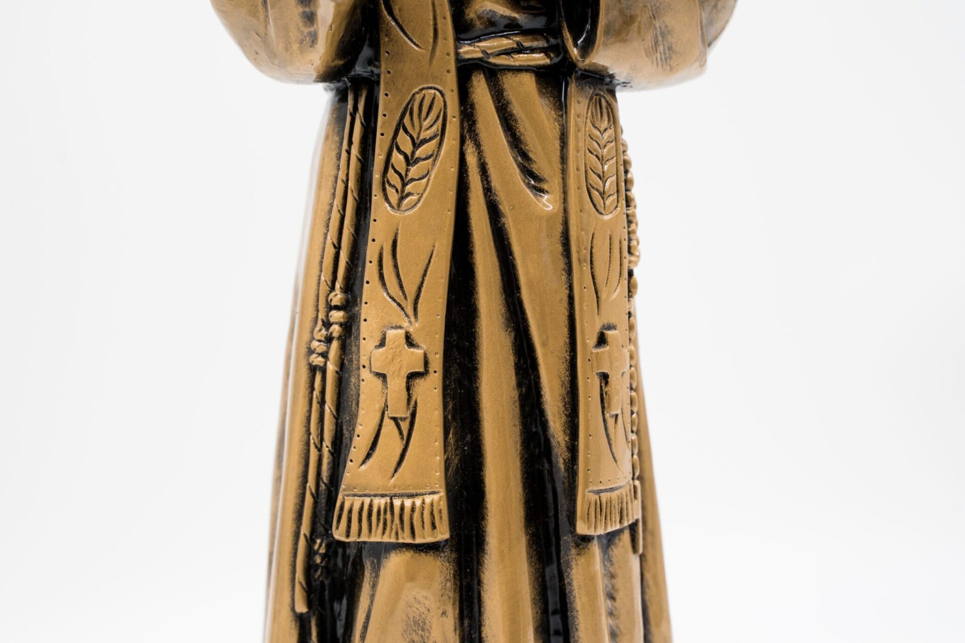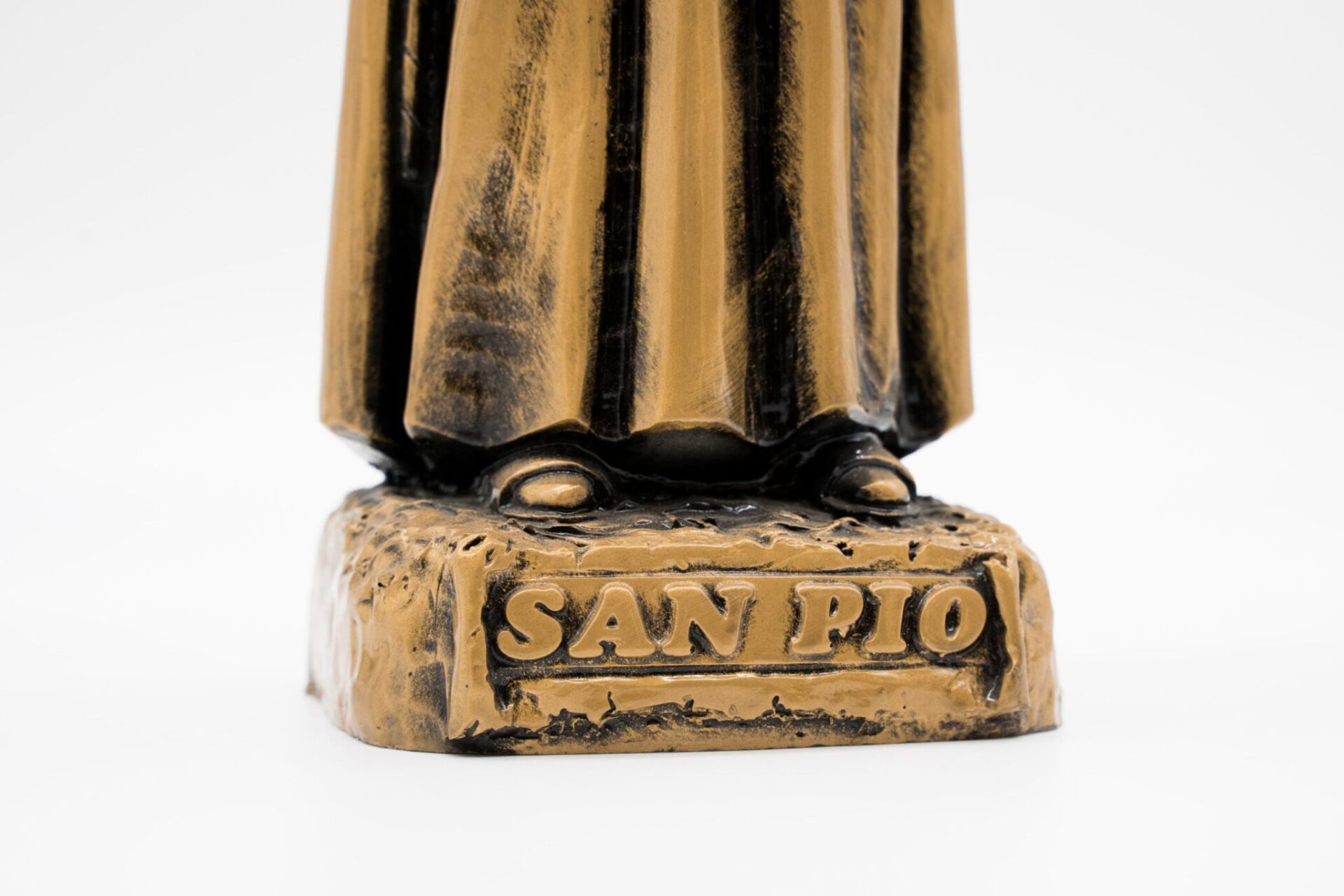 La statua rappresenta San Pio con un effetto bronzo che dona un aspetto realistico e venerabile.