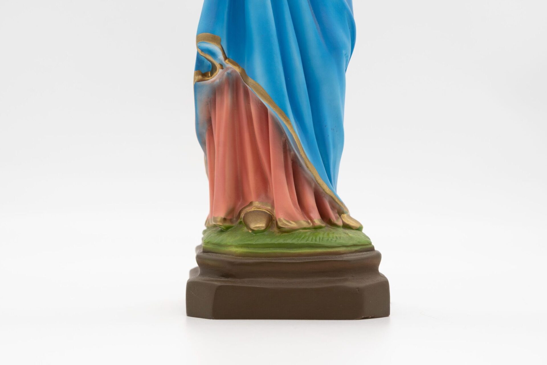 La figura è vestita con una tunica rosa e un mantello celeste con bordi dorati ai fianchi.