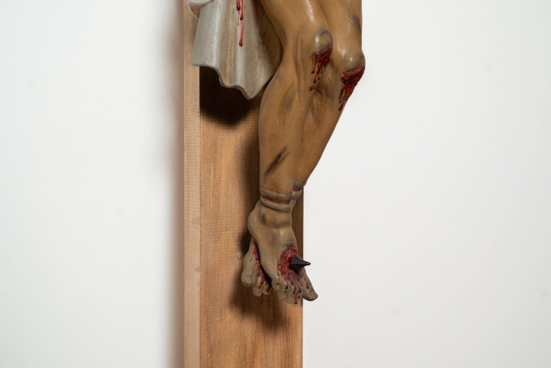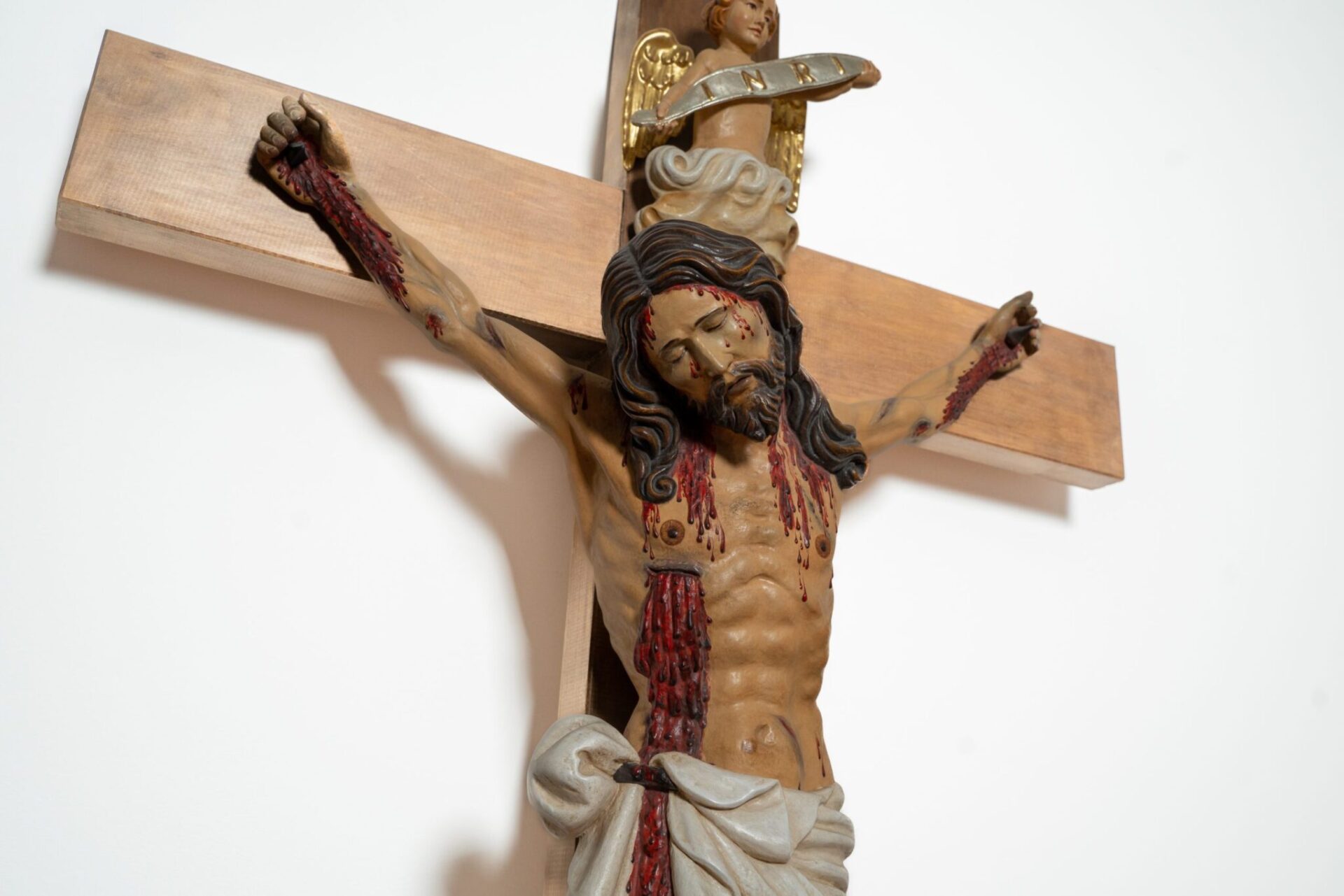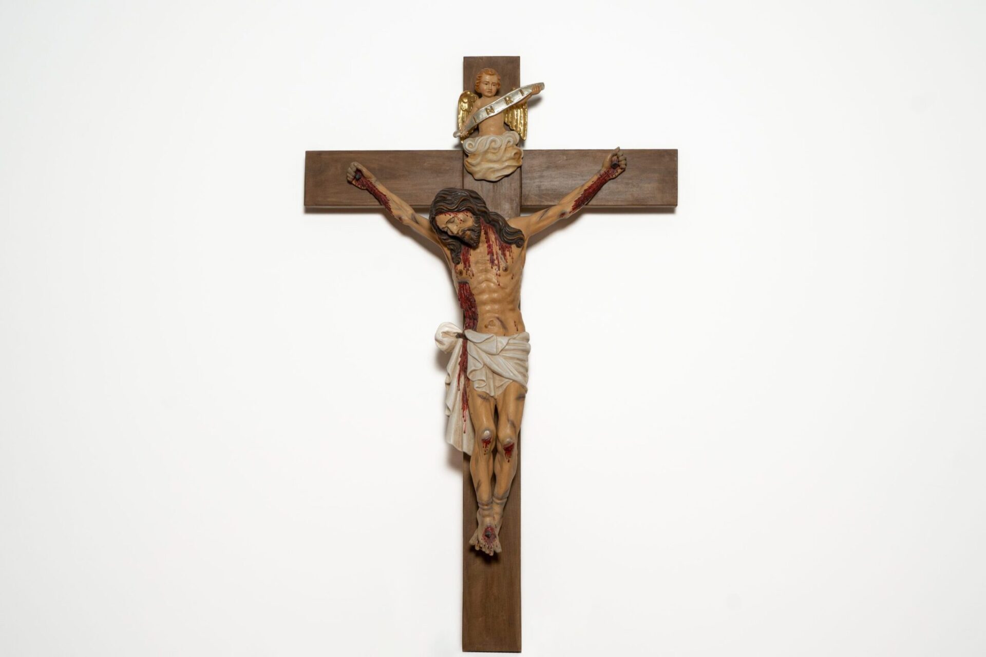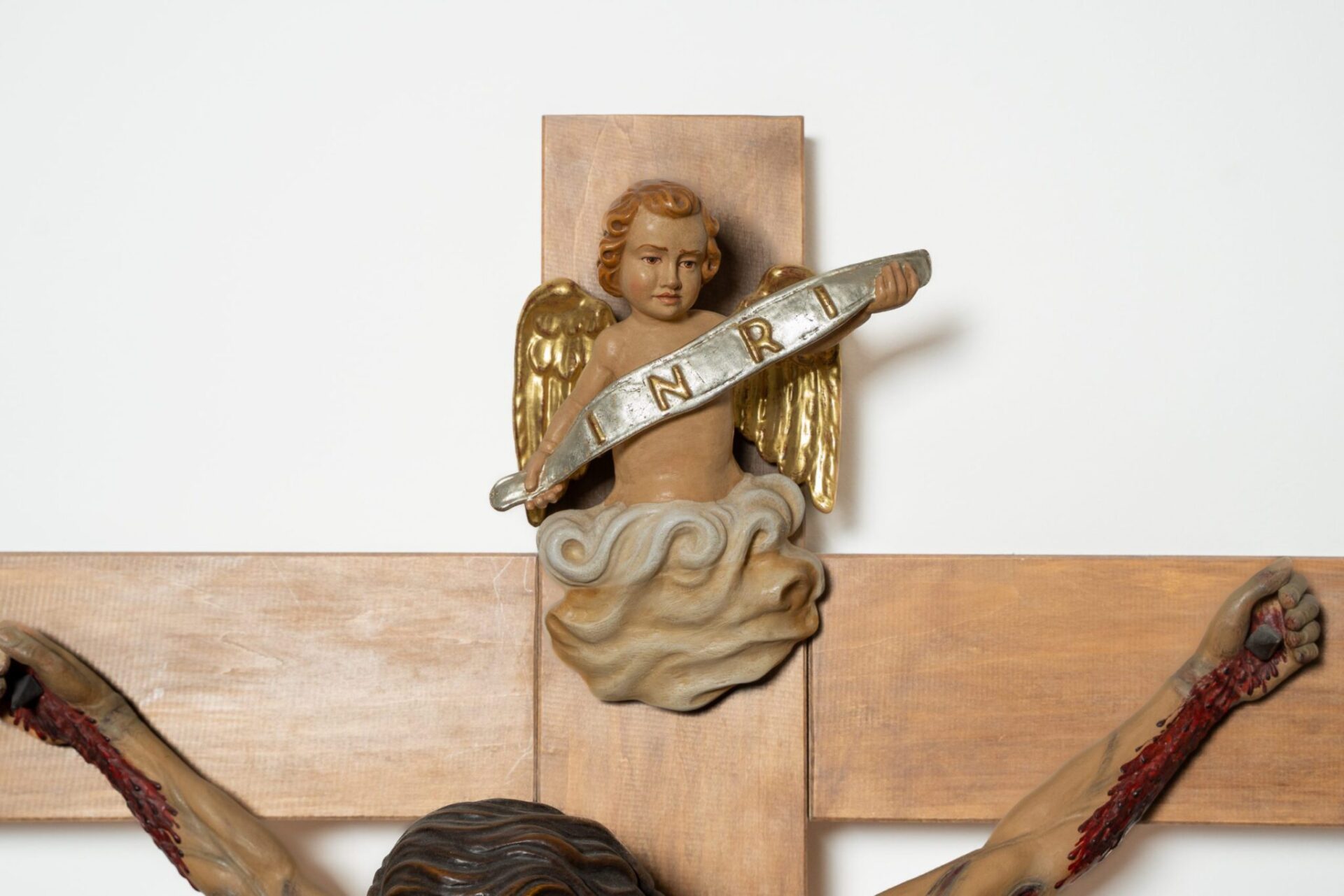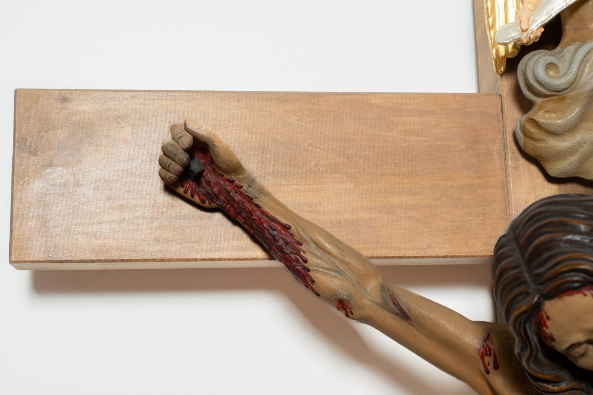 Crocifisso in legno interamente scolpito a mano in Italia.