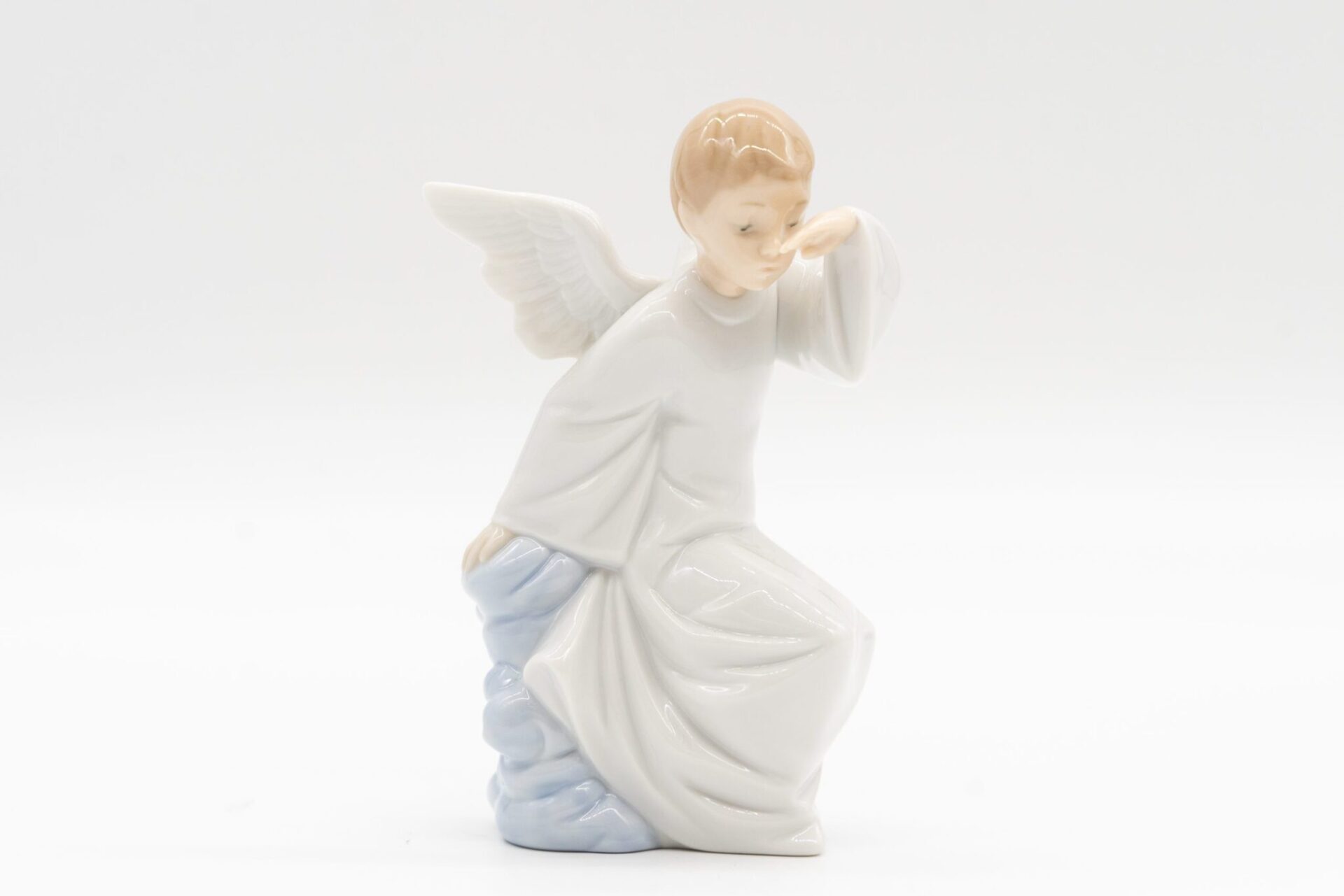 L’angelo è rappresentato con grandi ali bianche e indossa una veste lunga e bianca con un mantello azzurro chiaro. Ha un’aureola sopra la testa, simbolo di santità.