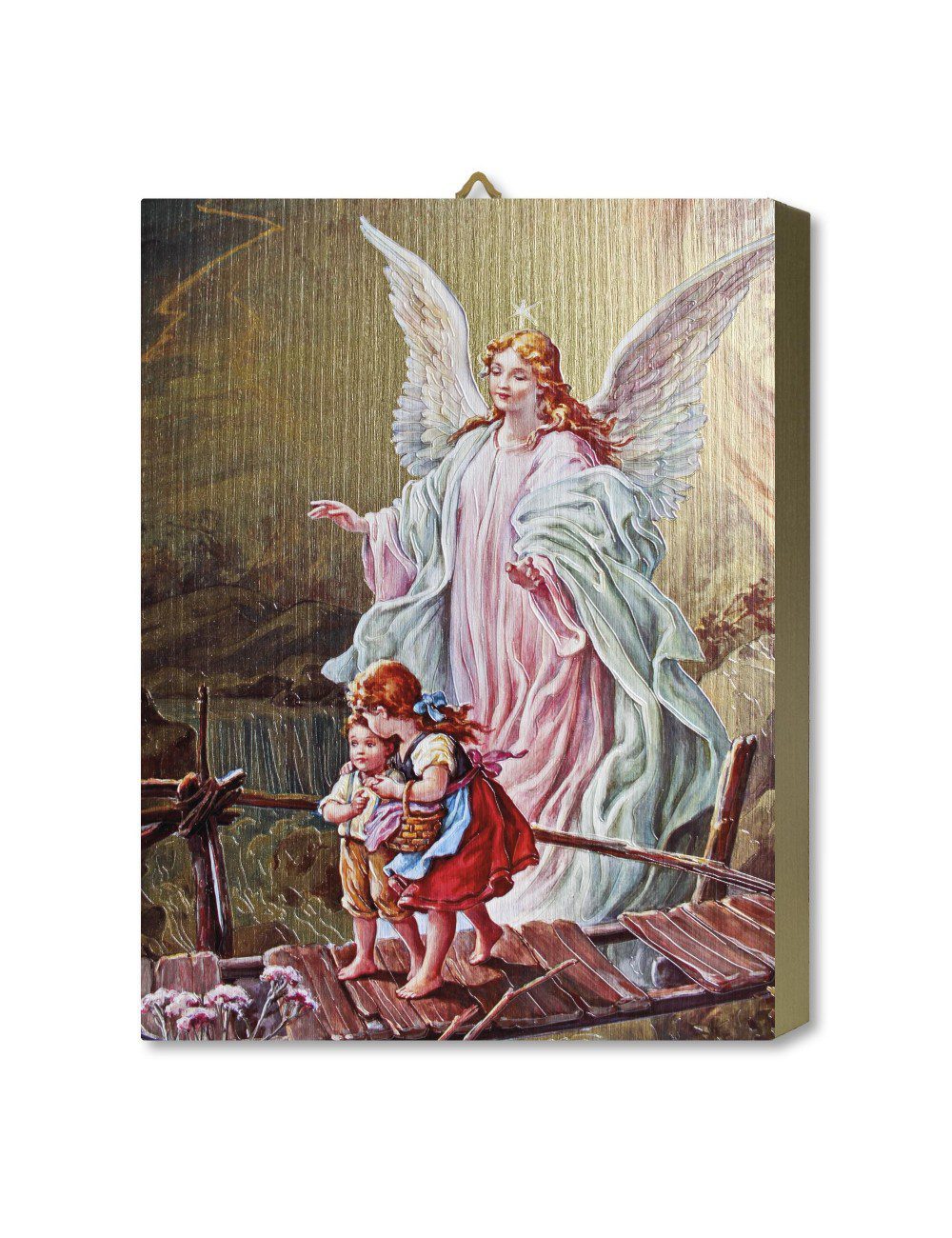 Questa tavola lignea raffigura l’Angelo Custode che protegge due bambini mentre attraversano un ponte di legno traballante sopra un fiume.