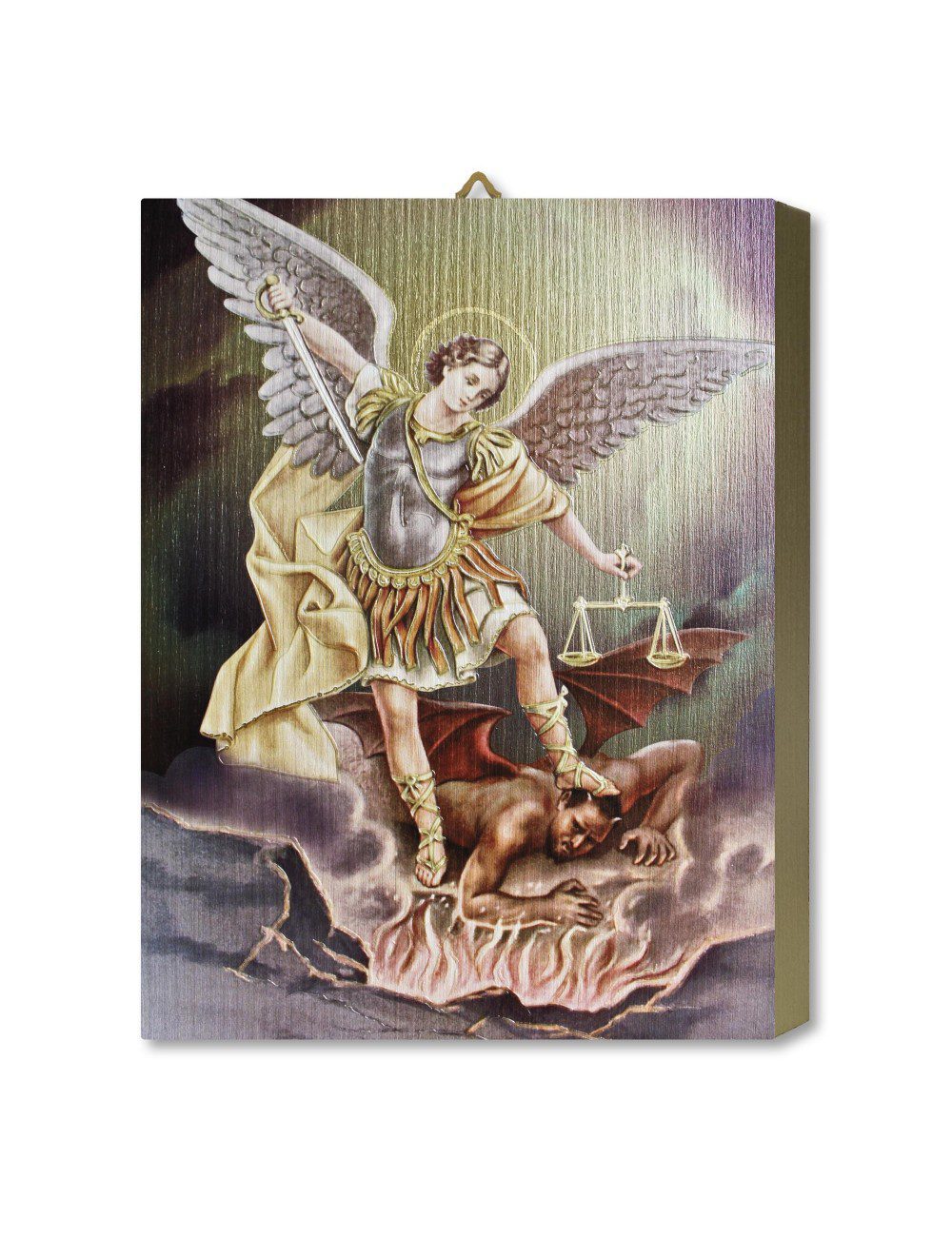 In questa tavola lignea, realizzata completamente in Italia, le più moderne tecnologie di trasferimento del colore si sono combinate alle antiche tecniche artigiane per dare vita ad un prodotto unico nel suo genere. L’uso sapiente delle velature dorate, l’effetto a rilievo dei dettagli e la brillantezza dei colori si combinano in un “unicum” capace di rivivere, reinterpretandoli, i capolavori dell’arte sacra.