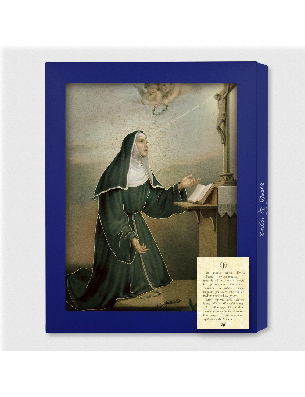 In questa tavola lignea, realizzata completamente in Italia, le più moderne tecnologie di trasferimento del colore si sono combinate alle antiche tecniche artigiane per dare vita ad un prodotto unico nel suo genere. L’uso sapiente delle velature dorate, l’effetto a rilievo dei dettagli e la brillantezza dei colori si combinano in un “unicum” capace di rivivere, reinterpretandoli, i capolavori dell’arte sacra