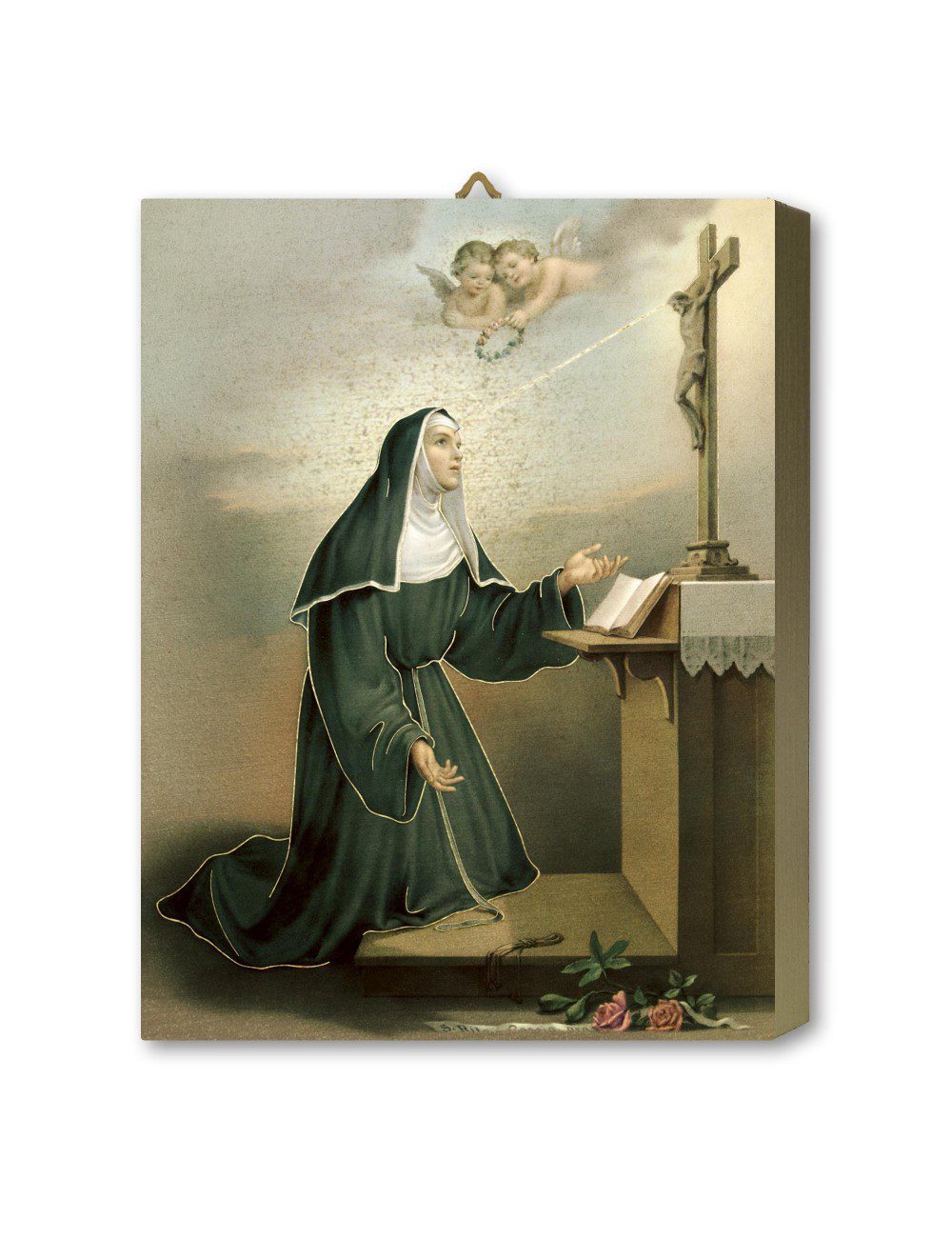 Questa tavola lignea raffigura Santa Rita da Cascia inginocchiata in preghiera davanti a un altare.