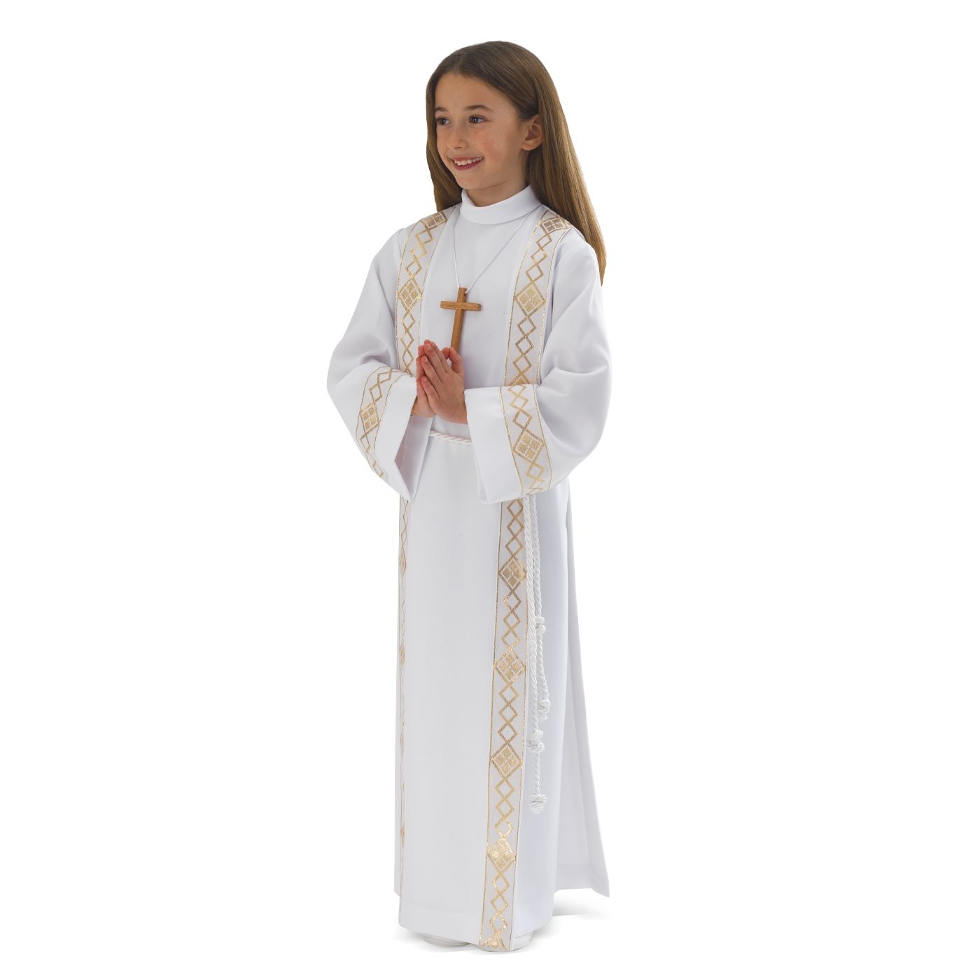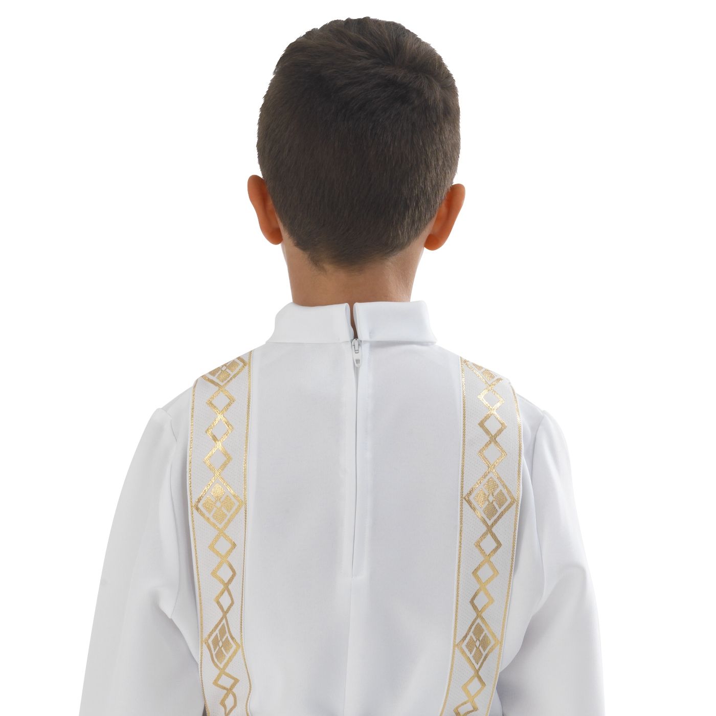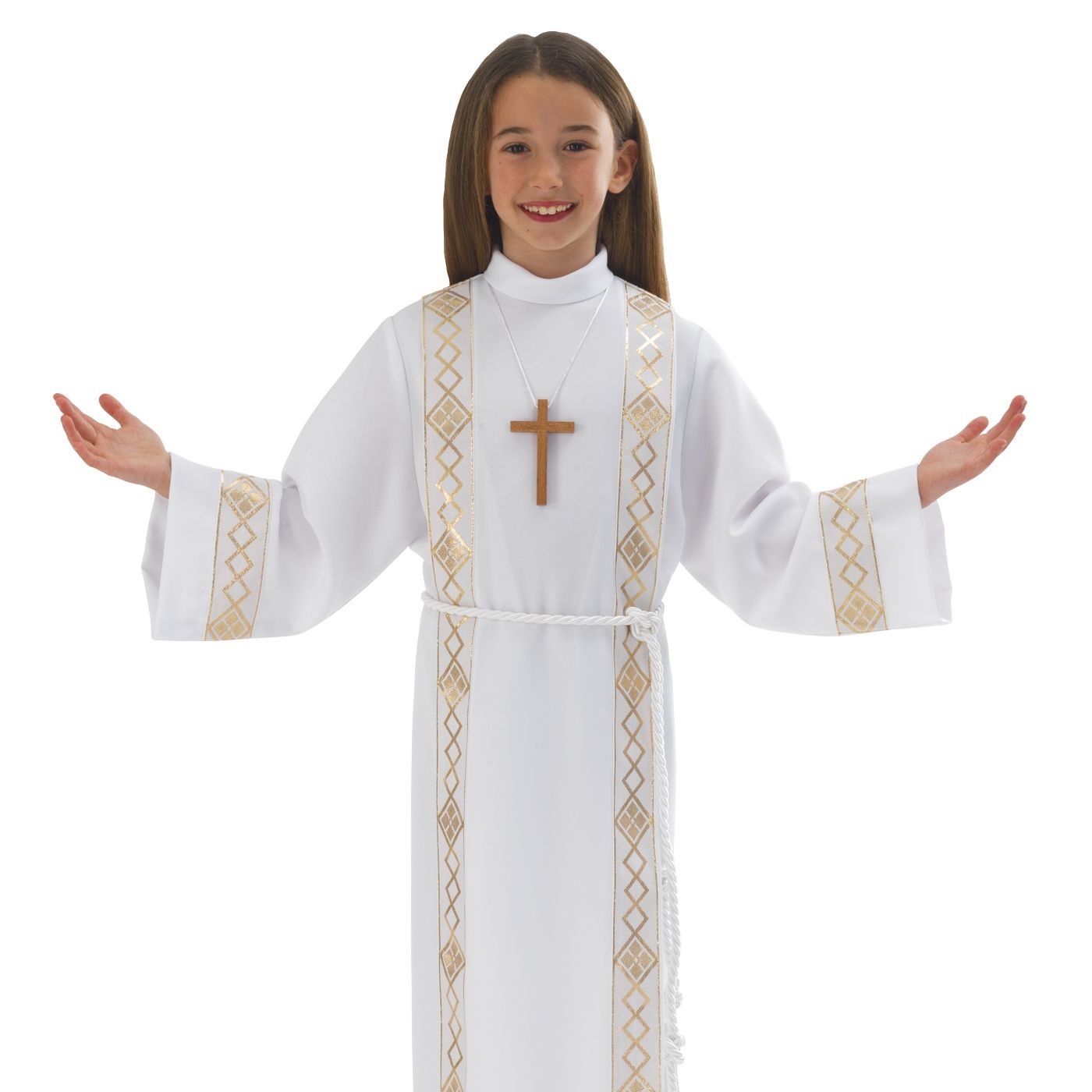 Gli accessori (croci, cingoli) e le acconciature (cerchietti e coroncine) eventualmente presenti nelle foto non sono compresi nel prezzo della tunica: possono essere ordinati a parte, scegliendo fra quelli proposti nelle rispettive categorie.