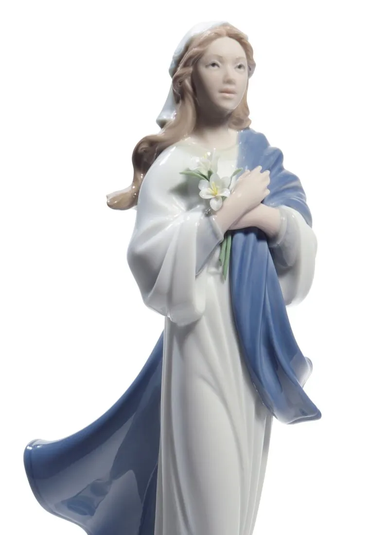 La Vergine Maria, madre di Cristo, ritratta in questo delicato pezzo con alcuni degli attributi principali associati alla tradizione, come il globo che la sorregge e i gigli bianchi, simbolo di purezza. Un pezzo di porcellana lucida, decorato in tenui tonalità pastello, oltre al blu intenso del mantello e agli smalti della base.